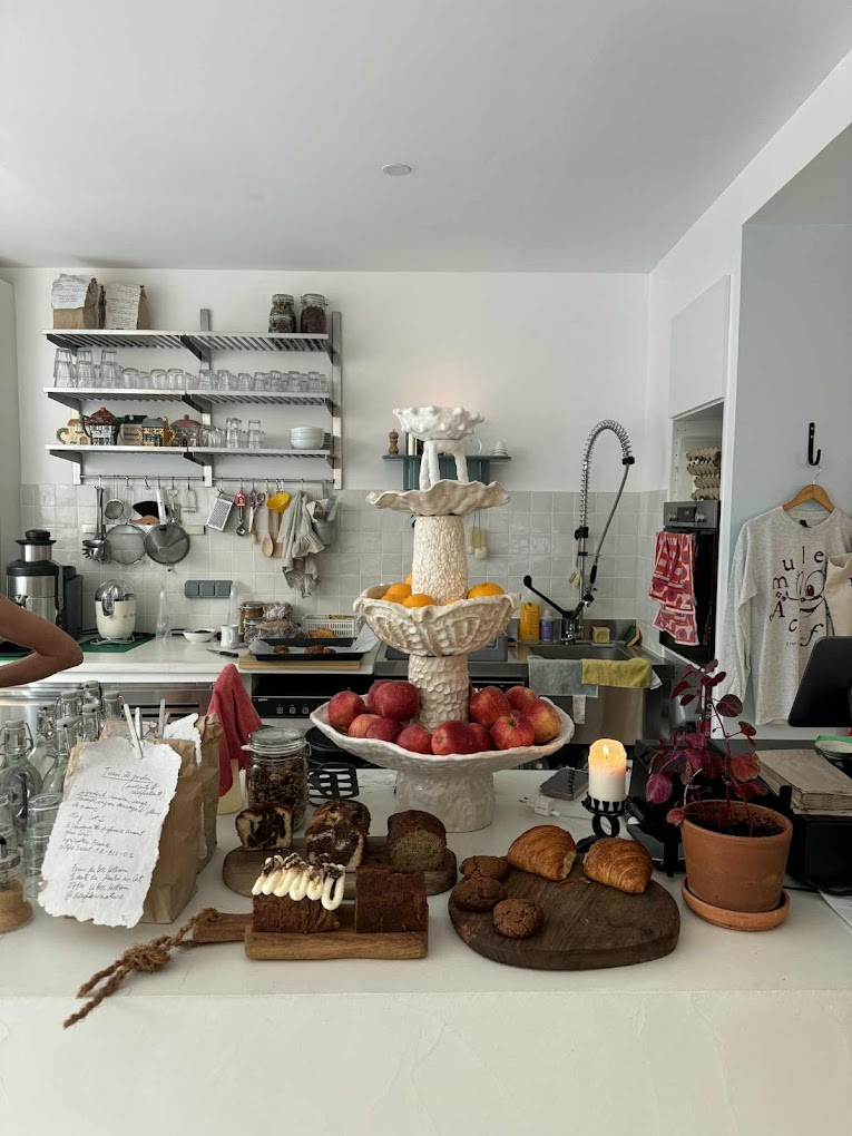 J’ai repris le local qui était un cube blanc. Auparavant, ça avait été un atelier d’artiste, mais ça faisait cinq ans qu’il n’y avait plus rien. J’avais une page blanche, c’est ce qui m’a vraiment plu. Je suis très visuelle, donc j’ai fait ça petit à petit, en mettant mes tables avec des chaises, en regardant comment les objets fonctionnaient ensemble. C’est vraiment comme ça, en tâtonnant, que j’ai conçu le lieu, avec mes idées, mes inspirations, ce que j’aimais.Il n’y a pas vraiment une influence, il y en a plein. Nous sommes des éponges : les réseaux sociaux, les voyages, on est inspiré par plein de cultures et de courants. C’est un micmac de tout ce qui m’a inspiré.