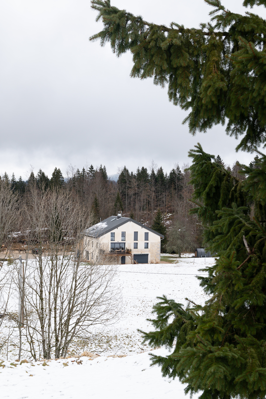 La Ferme Plume, c’est l’histoire d’un rêve devenu réalité. À la naissance de leur premier enfant, Marjorie et Jarno ont pris conscience que la vie à la ville n’est pas faite pour eux et qu’ils aspiraient tous les deux à retrouver la quiétude des villages de leur enfance. « Quand on s’est rencontrés avec Jarno, on se racontait ce qu’on voulait faire dans un monde idéal. Dans un coin de ma tête, j’espérais un jour ouvrir des gîtes. Recevoir, accueillir, ça me faisait envie… Pour Jarno, c’est un vrai retour aux sources puisque ses grands-parents tenaient un hôtel de village dans le Jura. » En 2019, le couple quitte Lyon direction la station des Rousses, au cœur du Parc naturel régional du Haut-Jura, avec l’envie de faire grandir leurs enfants au vert. Le projet touristique revient sur le devant de la scène lorsqu’ils ont l’opportunité d’acheter deux vieilles fermes en pierre du XVIIIe siècle situées dans un hameau isolé en lisière de forêt. « On a eu un gros coup de chance puisqu’on a entendu parler de la vente directement par les propriétaires qui venaient d’en hériter et souhaitaient s’en séparer. Lorsqu’on a vu l’emplacement incroyable avec son côté “bout du monde”, on savait que ce serait là », raconte Marjorie.