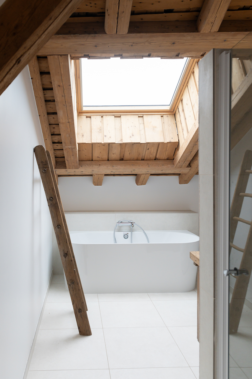 « Aujourd’hui encore, on se laisse régulièrement surprendre par la silhouette du renard qui passe devant les fenêtres, les chevreuils qui mangent en lisière de bois ou même par l’hermine qui sautille joyeusement dans le champ ! » Le meilleur endroit du gîte reste sans aucun doute la salle de bains, installée sous la charpente d’origine de la bâtisse, depuis laquelle il est possible de s’émerveiller sous le ciel étoilé. « C’est mon coin préféré, un vrai petit nid où se détendre », confie Marjorie. Confortablement installés, la montagne à l’horizon, les hôtes peuvent prendre le temps de se retrouver. Loin de tout, mais proches de l’essentiel.
