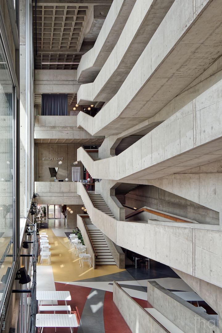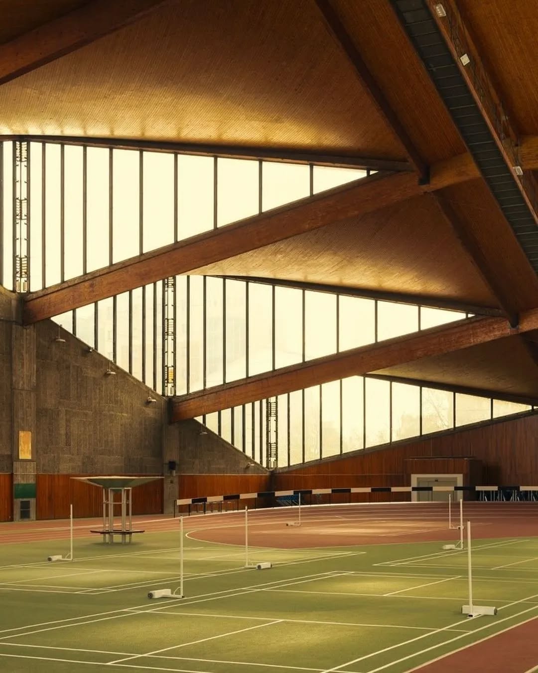 Construite initialement dans les années 1970 par J. Peccoux, on y retrouve un béton plissé et des toitures sculptées évoquant l’origami. Le projet récent de Dietmar Feichtinger réaménage l’ensemble autour d’un patio, ajoutant espaces de danse, de fitness et de repos.