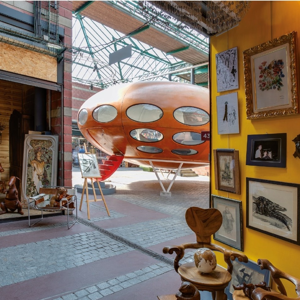 Ce module emblématique des années 1960, par l’architecte finlandais Matti Suuronen. en polyester et fibre de verre, affiche une silhouette en forme de soucoupe volante. Situé aux Puces de Saint-Ouen, il joue le rôle de pièce d’exposition hors norme, curieuse capsule rétrofuturiste.