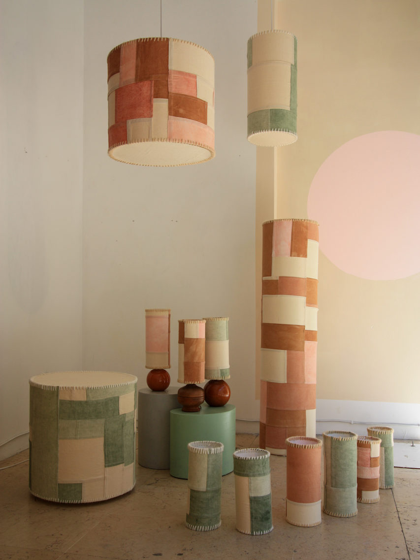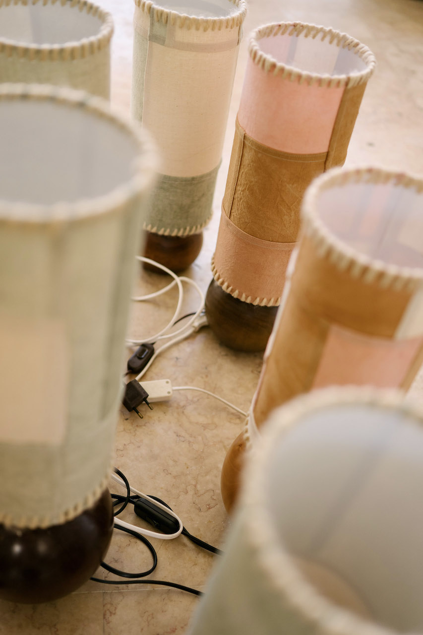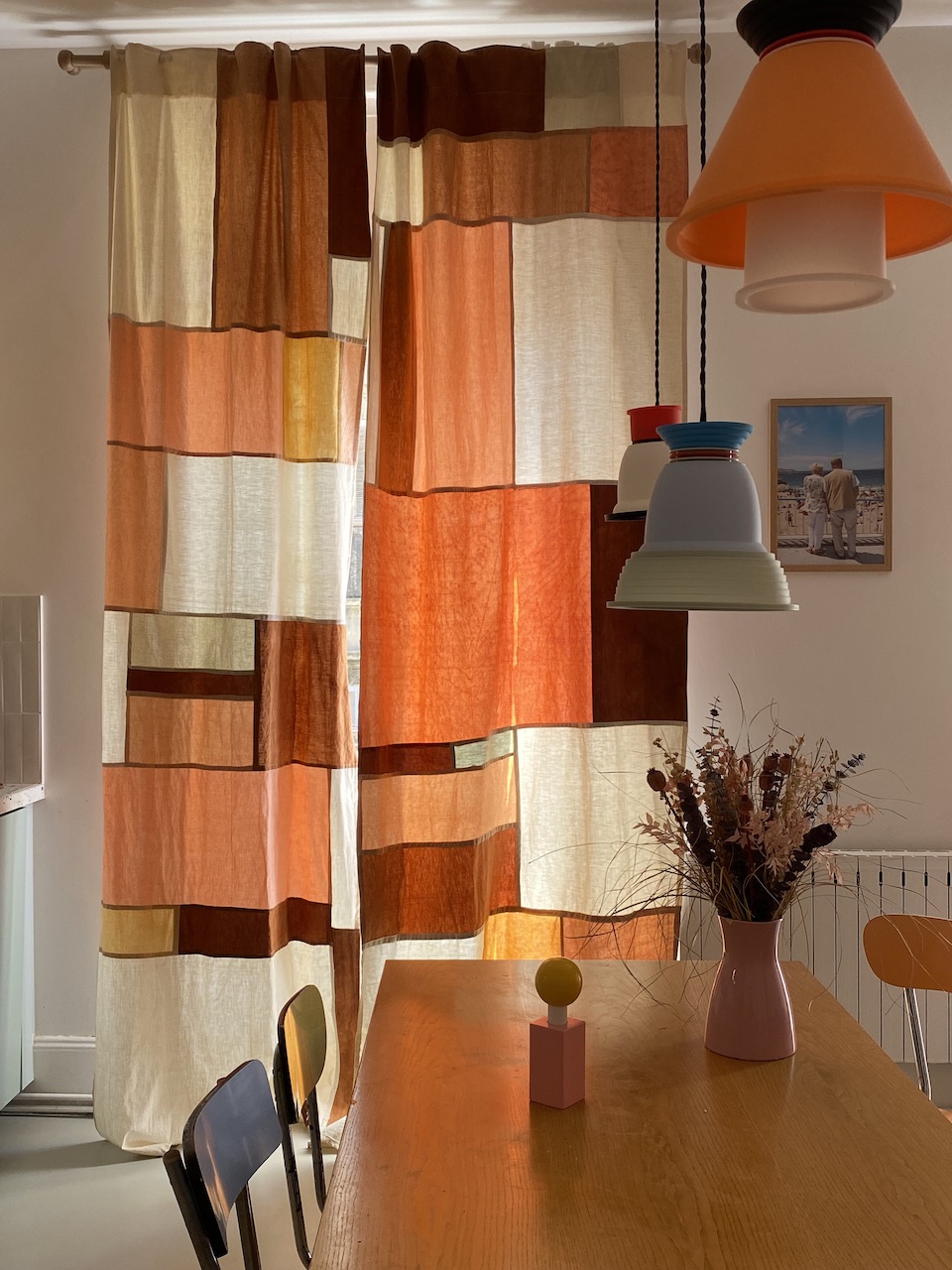 Le projet actuel, qui porte mon nom et que je mène seule, a pris forme alors que je confectionnais des patchworks pour des décors de shooting. On m’a proposé une exposition à Paris, avant que d’autres demandes pour confectionner de nouveaux patchworks ne suivent. Peu à peu, j’ai compris que ce que je voulais construire se situait à la croisée du design, de l’artisanat et de la création artistique. J’ai intégré l’Atelier Materia à Marseille, que je partage encore aujourd’hui avec d’autres créatrices. Après les patchworks, les lampes sont entrées dans mon univers lorsque la marque Sessùn m’a proposé une collaboration autour de sa lampe Ezia. J’ai également réalisé une série de lampes de chevet à partir de pieds chinés pour l’hôtel Amista à Marseille, en collaboration avec Dorothée Delaye. Je crée aussi des rideaux, toujours avec la technique coréenne du bojagi, qui consiste à assembler des carrés de tissus colorés pour former des compositions uniques. Le pliage et la couture suivent une méthode très précise qui permet un rendu réversible, comme une double lecture du textile.