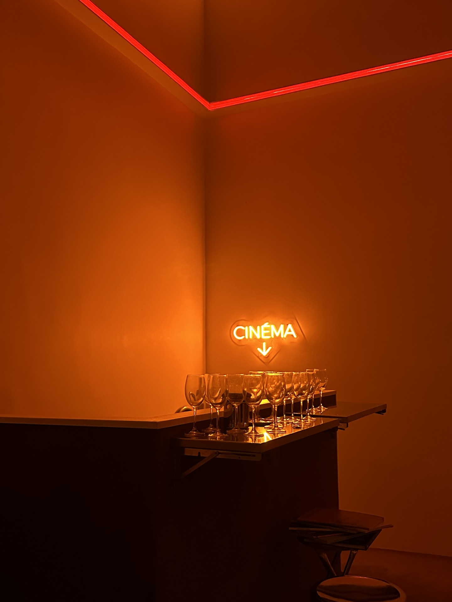 L’espace est pensé comme un petit salon ouvert, très chaleureux : l’ambiance est tamisée, les poufs se déplacent, les tablettes pliables s’adaptent pour une virée seul ou à plusieurs… Et au au sous-sol, se cache un micro-cinéma où toute la soirée des courts-métrages défilent, de quoi s’y attarder une heure ou trois.