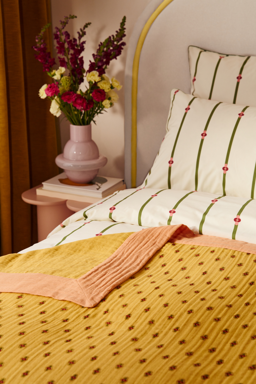 Deux parures de lit sont inaugurées sous ces vibrations ensoleillées, ainsi que plusieurs coussins à semer un peu partout dans la maison ! Un joli lit, c’est déjà la moitié de la résolution « dormir 8h » accomplie. Ou presque.