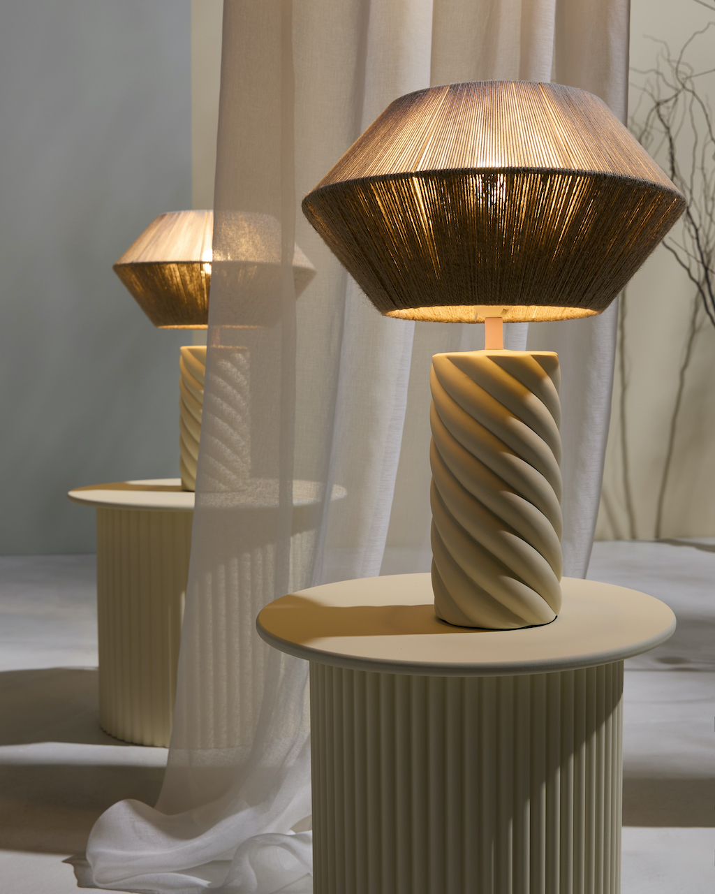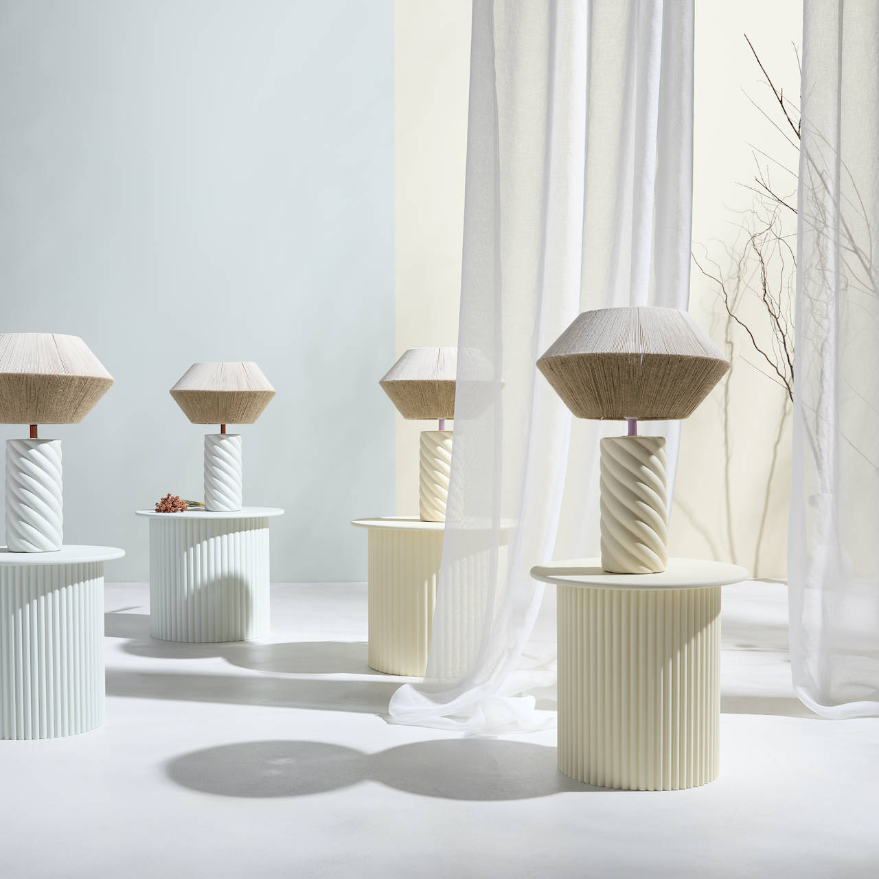 Sur un socle semblable à un tissage de corde, en twist, qui amène forme et mouvement à la lampe, la lumière se diffuse dans un jeu d’ombre et de jour. L’abat-jour à l’identité facilement reconnaissable de Maison Paloma prend la forme d’une soucoupe avec son cordage tissé en fils de coton dont l’apparence rappelle le raphia. Une note « kraft » tendance qui apporte de la douceur. Comme à l’accoutumée, le tissage est personnalisable selon les envies, inspirations, intérieurs ou extérieurs de chacun. Deux teintes de pied twistées sont disponibles – bleu très pastel et nude – des couleurs qui évoquent aussi bien la neige d’hiver que le grain de sable d’été.