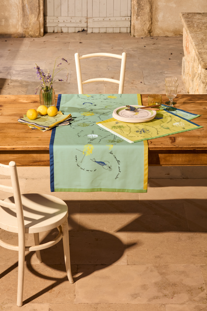 On rêvait de légèreté, Linvosges nous offre un brin de soleil. Pour sa deuxième collaboration avec l’illustrateur Serge Bloch, la marque transforme la table en jeu joyeux. Des personnages malicieux habillés de fruits et légumes gambadent sur les nappes et serviettes, distillant des jeux de mots savoureux : « Tu as un cœur d’artichaut », « Les carottes sont cuites », « J’ai fait chou blanc »… De quoi colorer les repas et faire sourire les convives.
