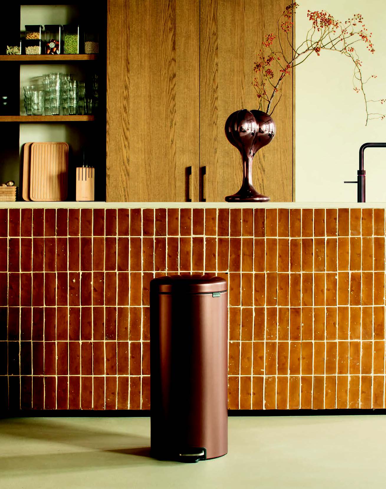 Fondée en 1919, la marque de design d’intérieur hollandaise Brabantia fabrique des articles ménagers pour la cuisine (gestion des déchets et ustensiles de cuisine), la salle de bains et le soin du linge. La poubelle Newicon 30 L s’impose comme un véritable objet de décoration avec son revêtement métallisé aux reflets chauds. Sa teinte Warm Bronze diffuse une atmosphère apaisante et élégante, apportant une touche de douceur à nos intérieurs. Elle est recyclable à 100 %.