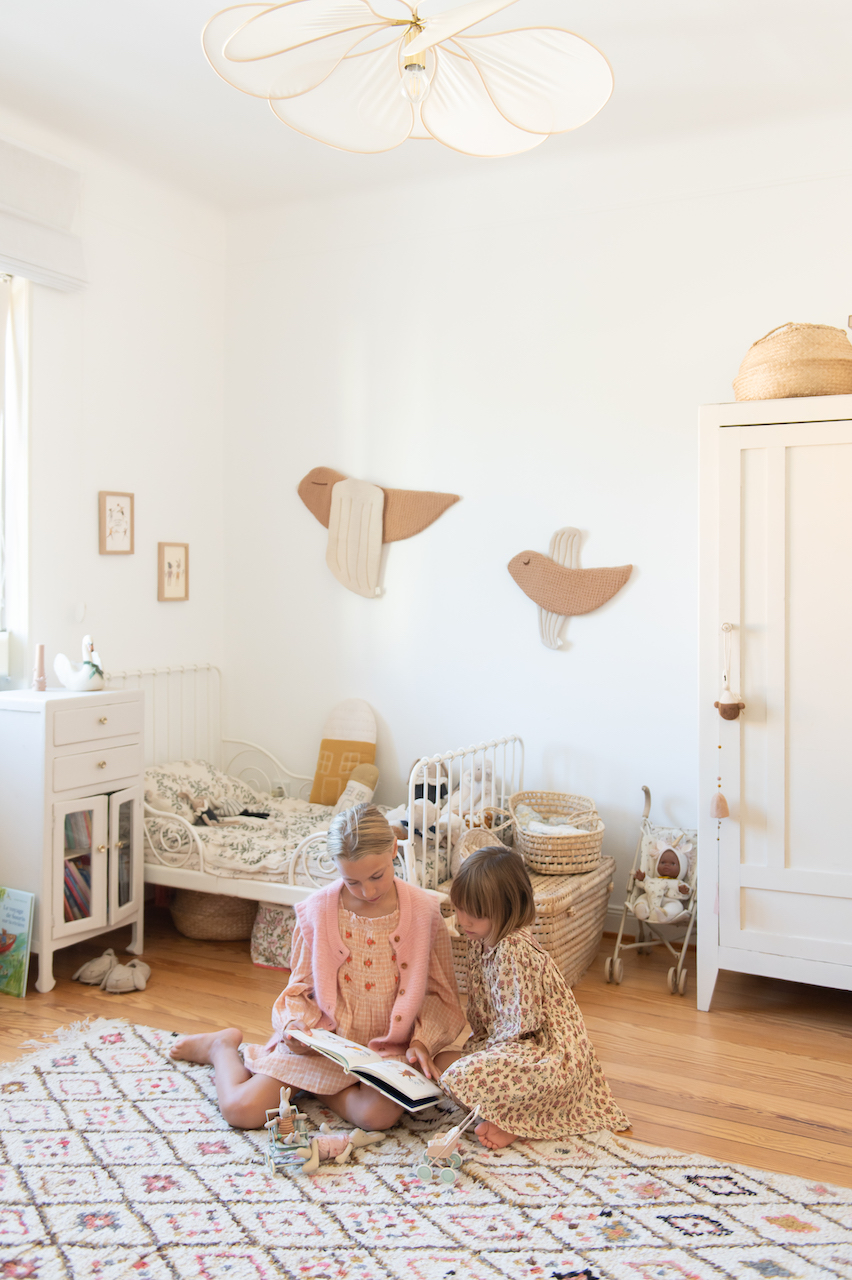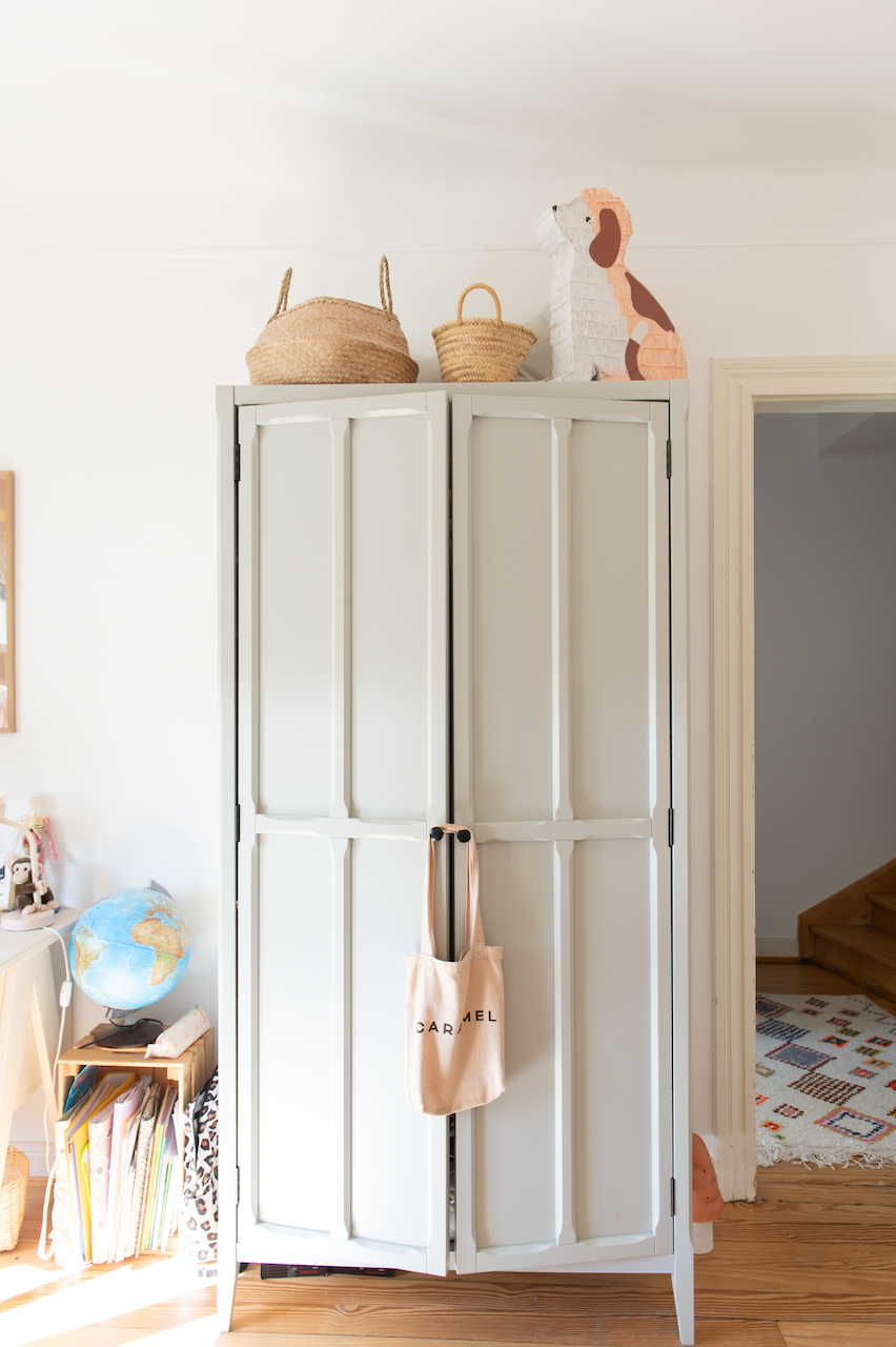 pour personnaliser autant que possible la décoration de la chambre des enfants. À défaut de papier peint comme elle l’aurait souhaité, elle a privilégié une pièce maîtresse pour habiller les murs, comme le ciel de lit chez Céleste ou les grands oiseaux en tissu chez Madeleine.Dans chaque chambre, les rangements ne manquent pas, avec un juste équilibre entre le mobilier chiné et les linéaires plus contemporains, toujours twistés avec un détail bohème, à l’image des portes en cannage. Les jouets, triés sur le volet, reflètent à la perfection la philosophie de La Manufacture Bohème. Figurines, poupées et bibelots en bois occupent d’adorables mondes miniatures que les filles font vivre au gré de leurs jeux ensemble.