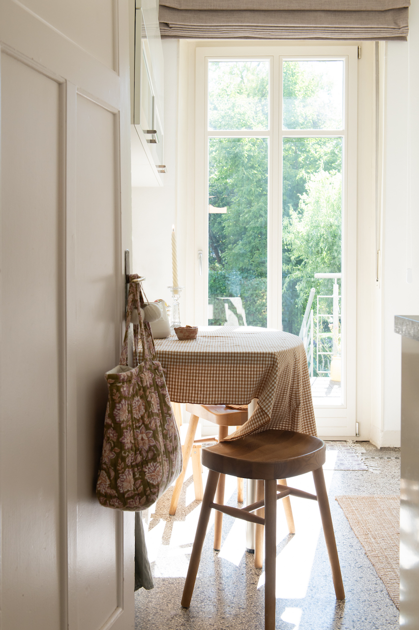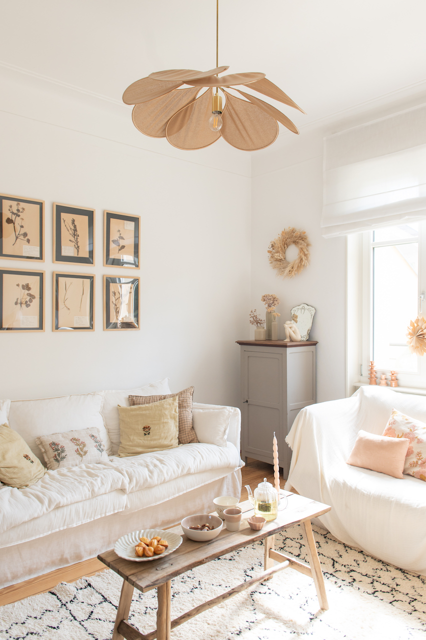 Le terrazzo d’origine dans l’entrée, l’escalier en chêne et les belles boiseries posaient déjà les bases d’un décor plein de charme. Clémence y a ajouté les mêmes ingrédients que ceux qui ont fait le succès de la boutique pour métamorphoser cette maison mitoyenne des années 1950 en un cocon doux et feutré. « Je suis attachée à l’harmonie que dégage un intérieur. Comme j’aime mélanger les styles, je joue avec les couleurs et les matières pour former un ensemble authentique et agréable à vivre. » La palette de la maison se décline ainsi dans des nuances neutres et poudrées : blanc, beige, rose, avec des touches de vert. Omniprésent, le bois est tempéré par des textiles naturels comme le lin ou le feutre de laine qui viennent sublimer son allure brute ou patinée. Le rotin n’est pas en reste, contribuant à l’esprit bohème des lieux. Un peu partout, les fleurs séchées ou imprimées déploient leur silhouette gracile, insufflant une dimension délicieusement romantique à la décoration.