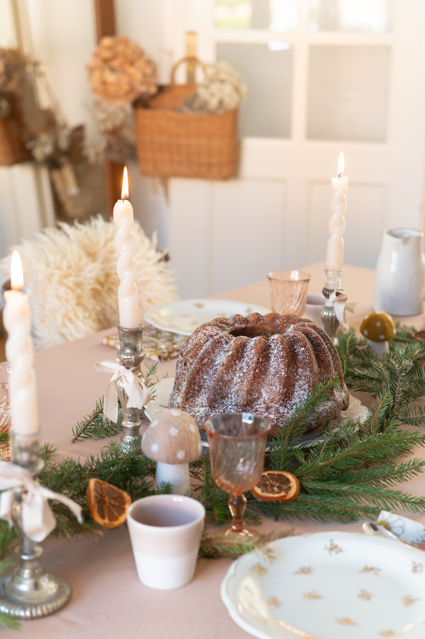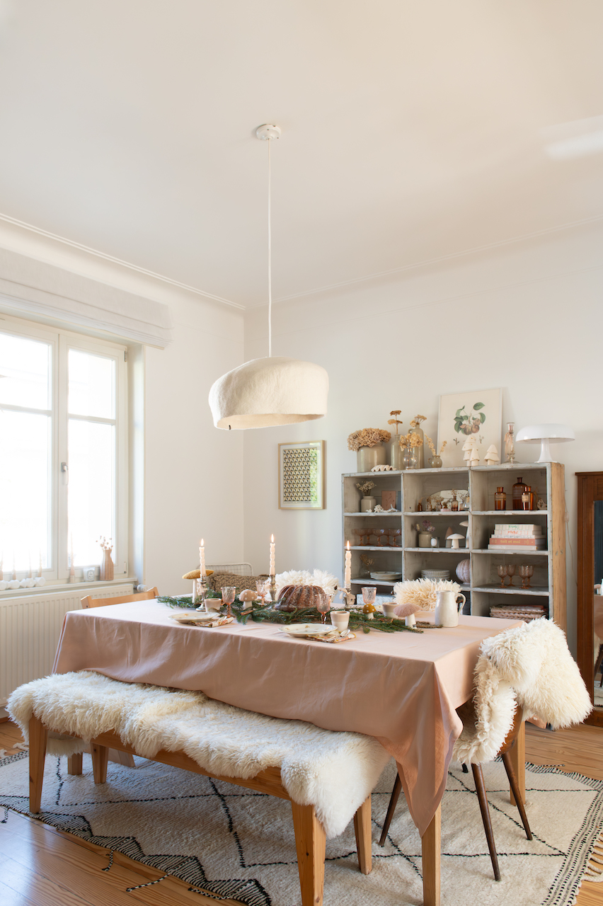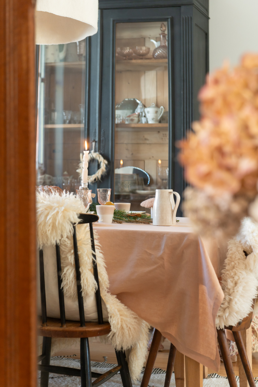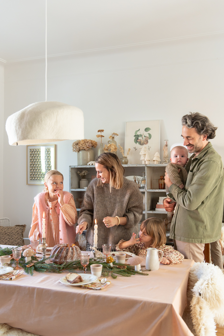 Dans la maison, les trouvailles de chine, les objets de décoration scandinaves et les pièces artisanales marocaines se côtoient dans une atmosphère enveloppante. Un joyeux mélange choisi avec amour par Clémence au gré de ses “chineries”. « Mon style est tout sauf épuré, mais j’aurais du mal à me sentir chez moi sans tous ces petits objets ! J’aime l’histoire qu’ils me racontent à chaque fois que je les regarde. » Pots en grès, miroirs, bougeoirs, herbiers, vaisselle… Clémence accumule les trésors anciens, créant ici et là des compositions délicates et poétiques. « Je fonctionne à l’émotion, au coup de cœur. J’adore l’idée de partir chiner en ignorant totalement avec quoi je vais revenir ! » Elle rapporte aussi toujours des souvenirs de vacances ou de ses voyages au Maroc où elle se rend régulièrement avec sa sœur pour approvisionner la boutique. Tout naturellement, cet esprit singulier et chaleureux transparaît dans les rituels que Clémence et sa famille retrouvent avec bonheur chaque année pour préparer les fêtes de fin d’année.
