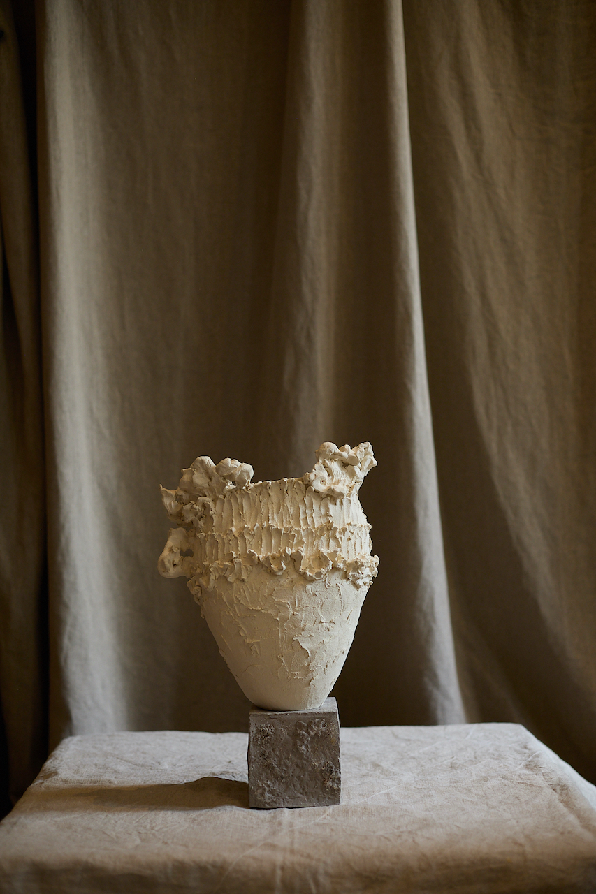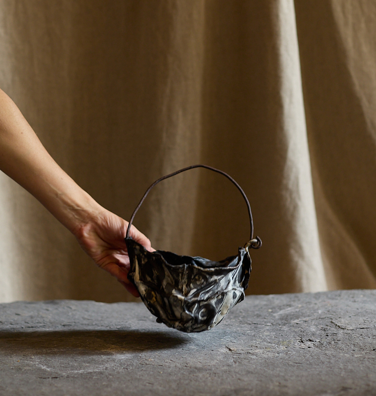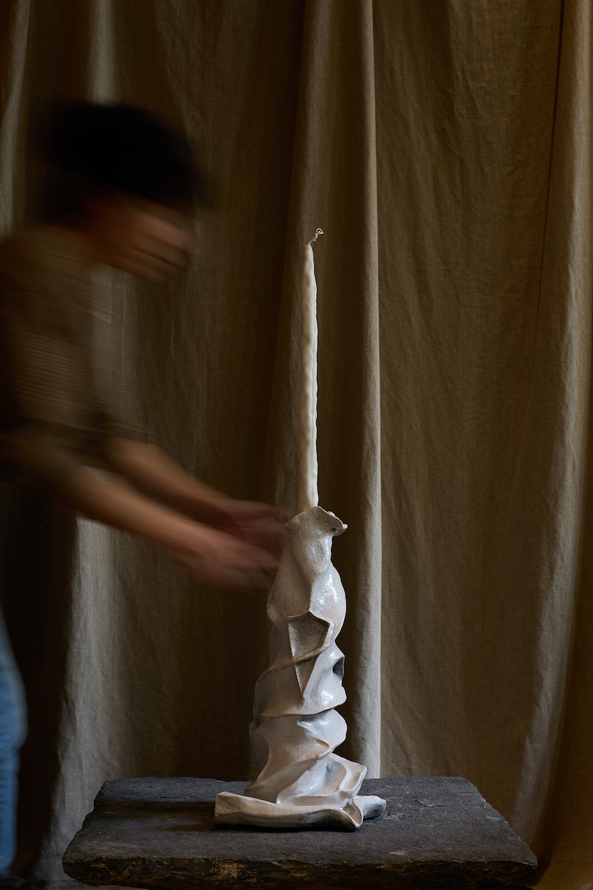 Un cabinet de curiosités au détour d’un couloir du studio KO, l’agence d’architecture d’Olivier Marty et Karl Fournier. On pousse la porte et l’œil ne sait plus où donner. Sur les étagères s’accumulent des sculptures de pierre taillées à la main, des céramiques aux formes organiques, des pièces de bronze qui captent la lumière. Ici, une lampe soufflée dans un moule en plâtre, là, des tissus de lin transformés en porcelaine translucide. Les univers se mêlent : la terre avec ses grès, la mer évoquée par des formes ondulantes, l’air capturé dans des bulles de verre. Des plumes côtoient du métal brut, des fils tissés rencontrent la pierre calcaire. « Il y a aussi bien de la terre que de la mer. Là un taureau, du cuir de veau, ici du coquillage », résume Nathalie Guihaumé, directrice artistique du lieu.