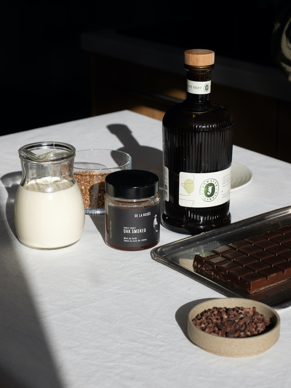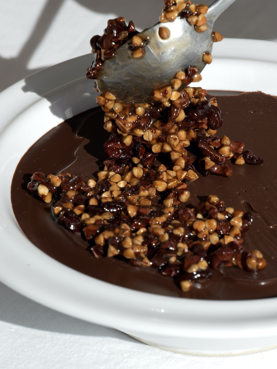 Juste avant de servir, mélanger le sarrasin torréfié, le grué de cacao, le miel fumé et l’huile d’olive. En hiver, le miel s’épaissit, commencer par le détendre avec l’huile d’olive avant d’ajouter le reste. Goûter et ajuster les proportions selon vos préférences.