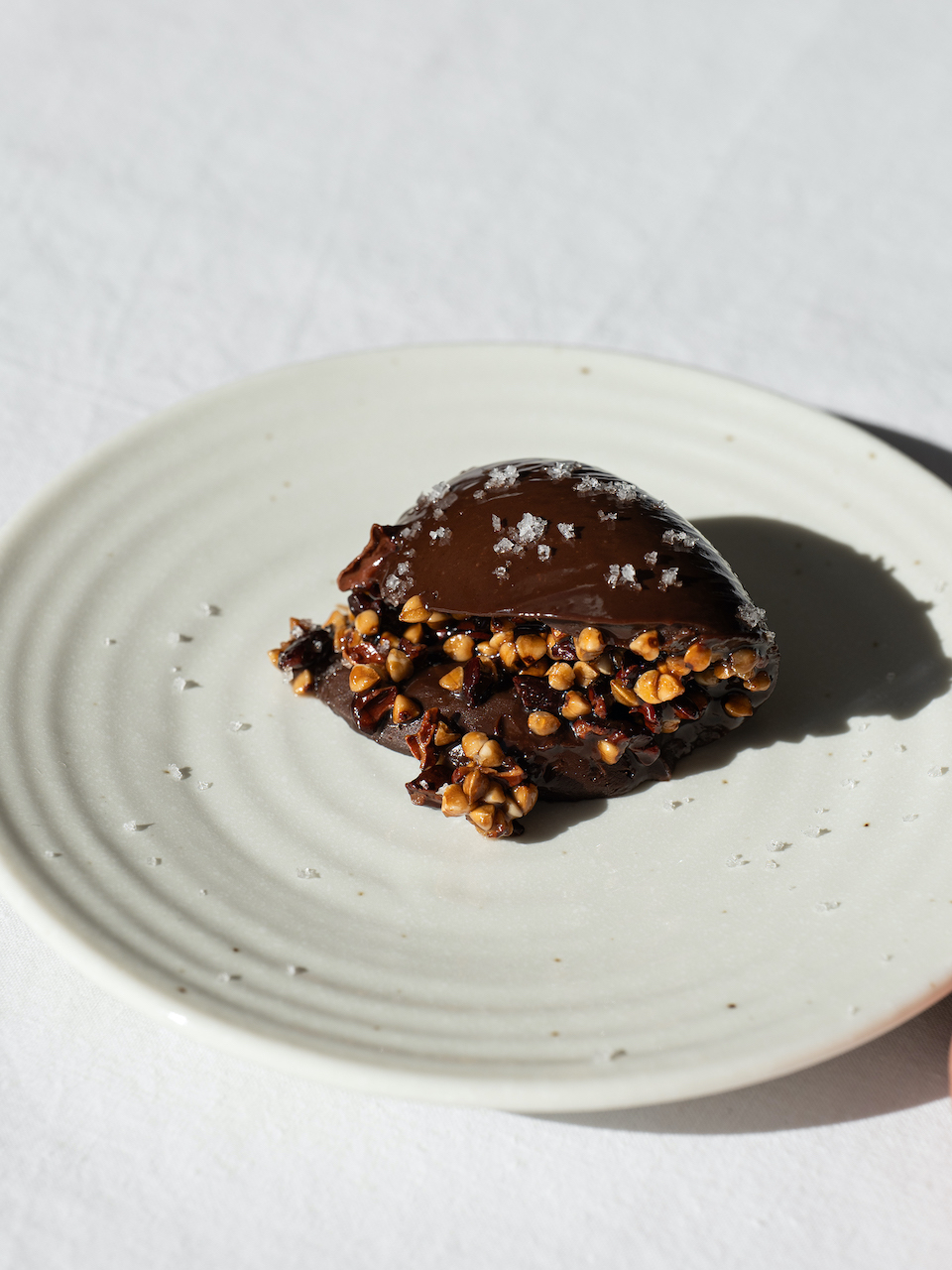 Pour la version assiette : verser un peu de crunch sur la ganache et ajouter un peu de fleur de sel.