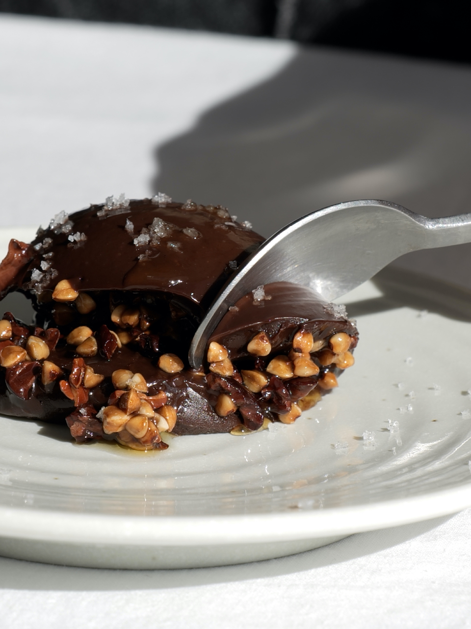 Pour la version quenelle : ajouter le crunch sur la ganache, réaliser une quenelle qui va venir emprisonner le mélange et servir avec un extra d’huile d’olive et un peu de fleur de sel.