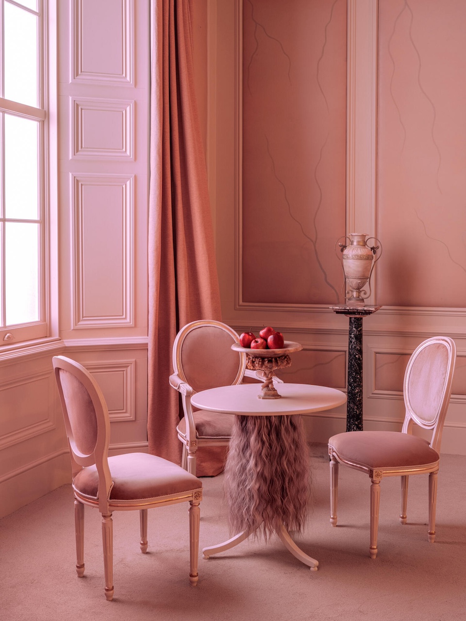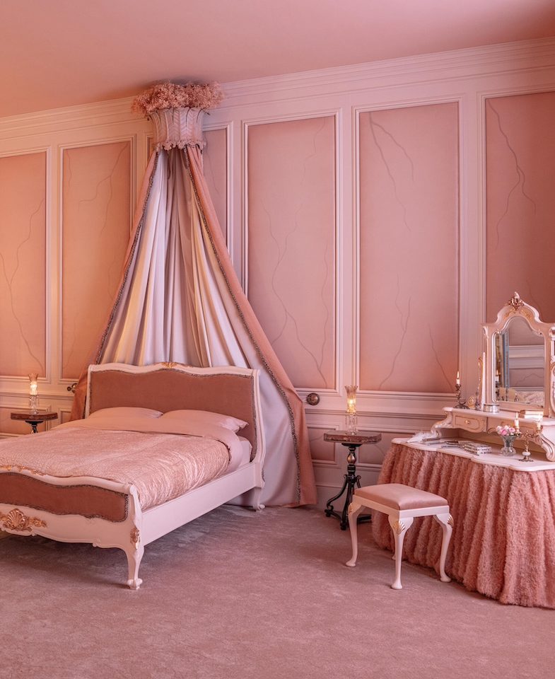 En exclusivité sur Airbnb, la chambre de Cathy à Thrushcross Grange ouvre ses portes. Tout droit sortie des rêves du film, elle incarne l’obsession amoureuse d’Edgar Linton pour son épouse. Les murs couleur chair enveloppent l’espace. Le rose se décline à l’infini : draps satinés, coussins aux motifs évoquant des veines, jusqu’à la tasse posée sur la table de chevet.