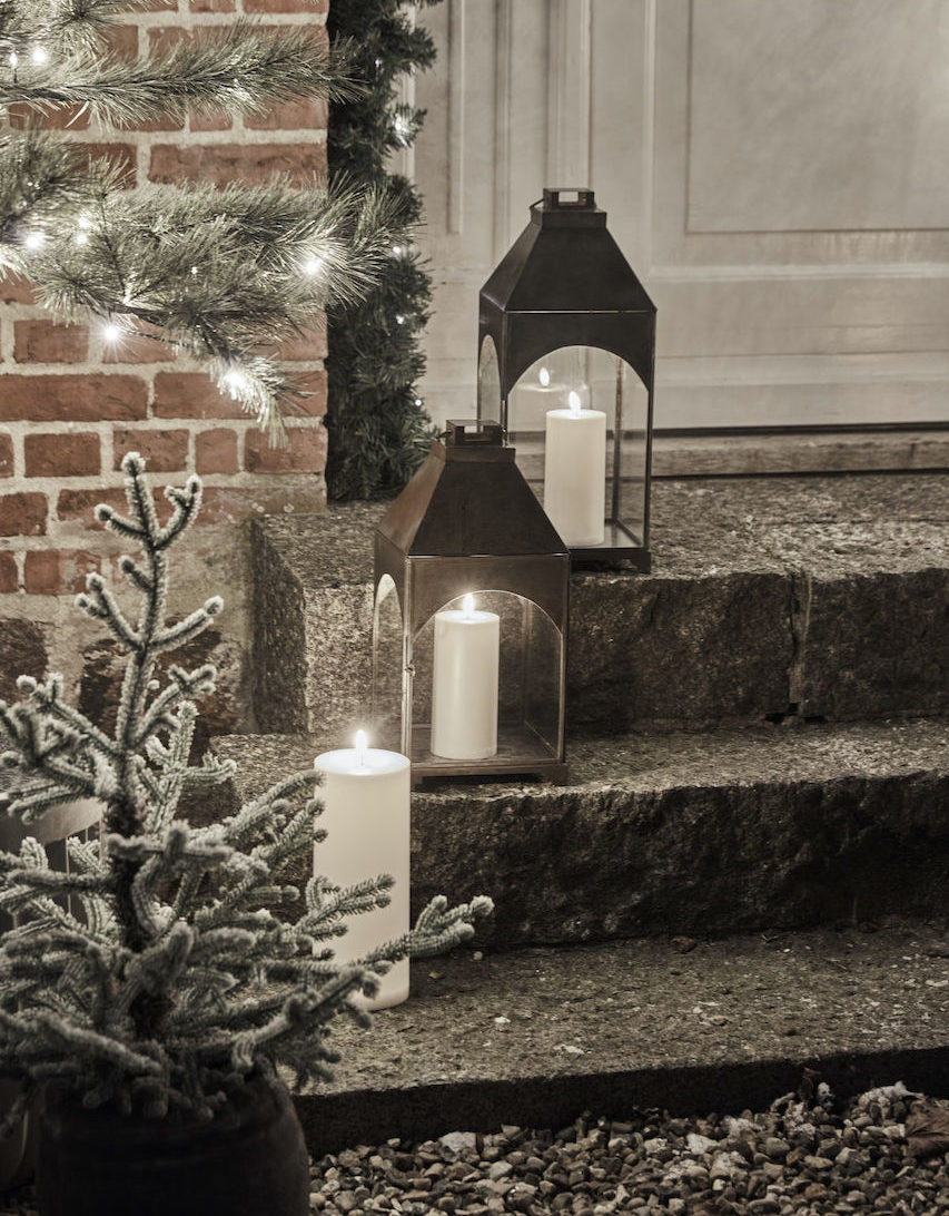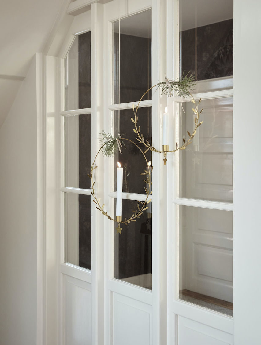 Avant même de franchir la porte, l’esprit de Noël se dévoile. Dans le froid de décembre, quelques signes discrets suffisent à planter le décor, à commencer par l’éclairage : lanternes alignées sur les marches, étoiles scintillantes piquées dans le gazon et guirlande courant sur la façade jouent la carte de la sobriété et de l’élégance. Et pour parfaire l’ambiance, une couronne végétale sur la porte, un sapin en pot près de l’entrée principale ou encore une luge ancienne chinée scellent la composition extérieure, subtile alliance entre naturel et tradition