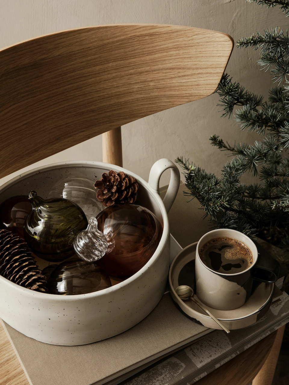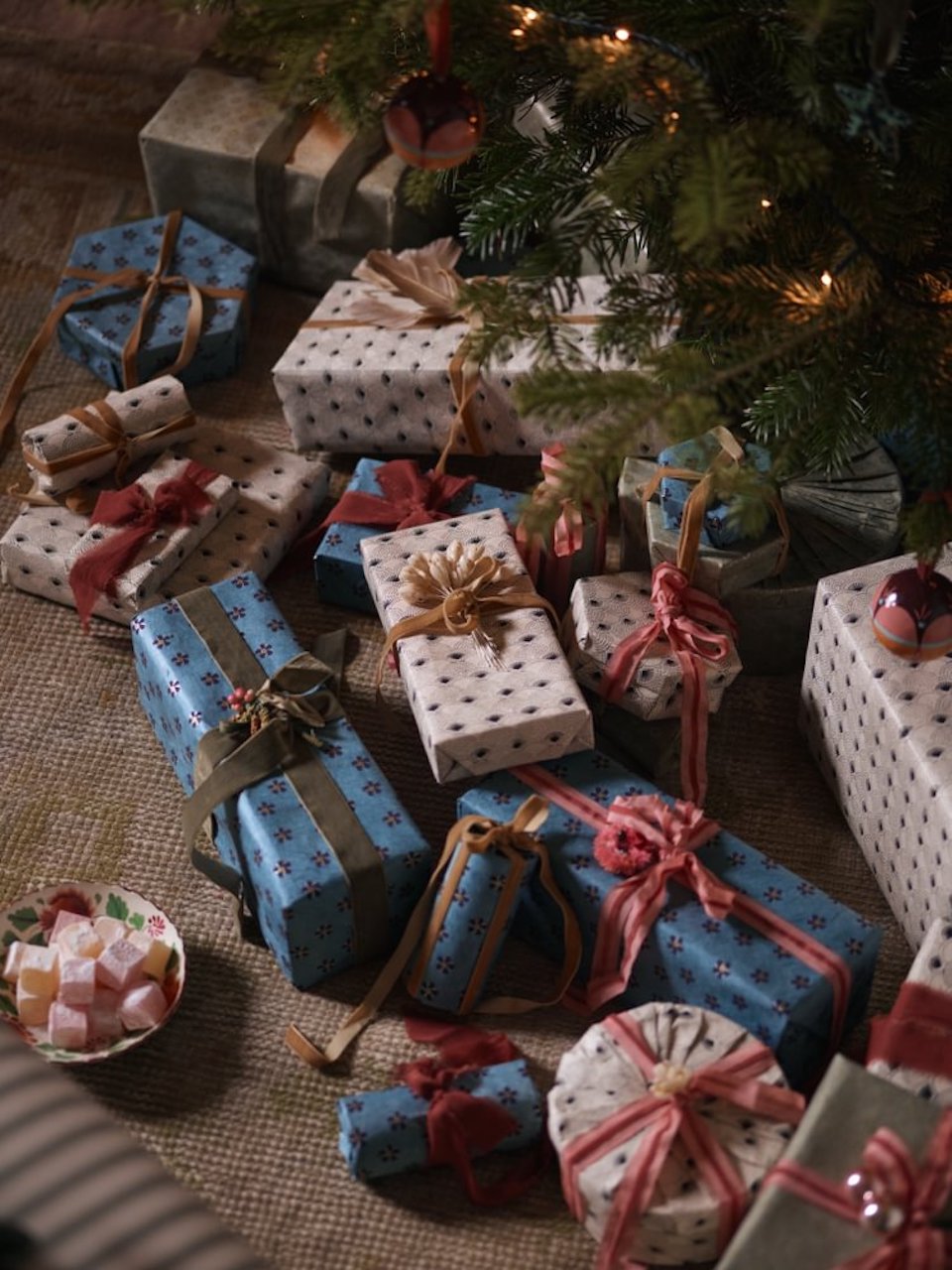 Impossible d’imaginer Noël sans lui. Le sapin règne dans la maison comme un symbole, témoin des préparatifs et gardien des présents. Sur ses branches, boules en verre et ornements cohabitent avec des guirlandes en papier apportant de la légèreté à l’ensemble. Au sommet, une étoile en coton signée Ferm Living ravive la nostalgie des décorations faites à la maison, tandis qu’à ses pieds, les paquets s’empilent, enveloppés de jolis papiers. Leur présence suffit à nourrir la féerie de l’attente, comme un avant-goût des réjouissances à venir.