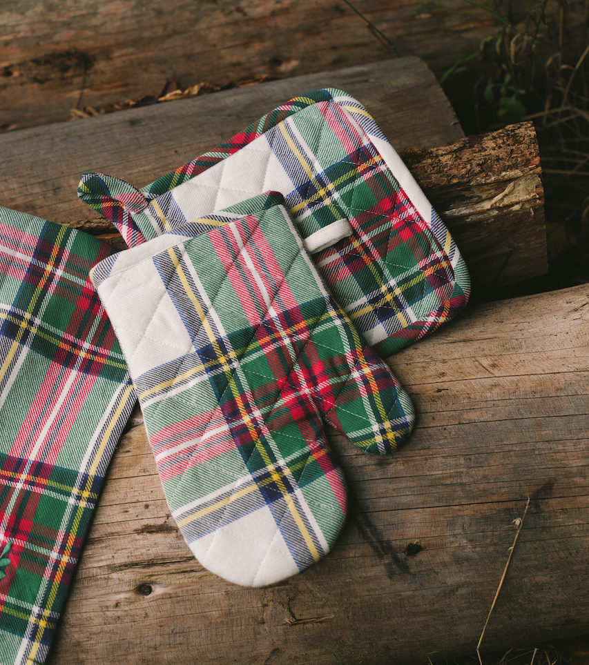 À Noël, la cuisine devient un atelier festif, où se mélangent parfums d’épices et convivialité. Suspendu au four, un torchon imprimé de sapins minimalistes annonce la saison. Sur le plan de travail, le rouleau à pâtisserie gravé dépose ses motifs joyeux sur les pâtes dorées, bientôt découpées à l’aide d’emporte-pièces en forme de renne ou de sapin. Les moules à mini-cakes accueillent, eux, de tendres bouchées à partager à l’heure du goûter. Et pour orchestrer ce ballet gourmand, gant et manique en tartan se glissent comme complices chaleureux de chaque fournée.