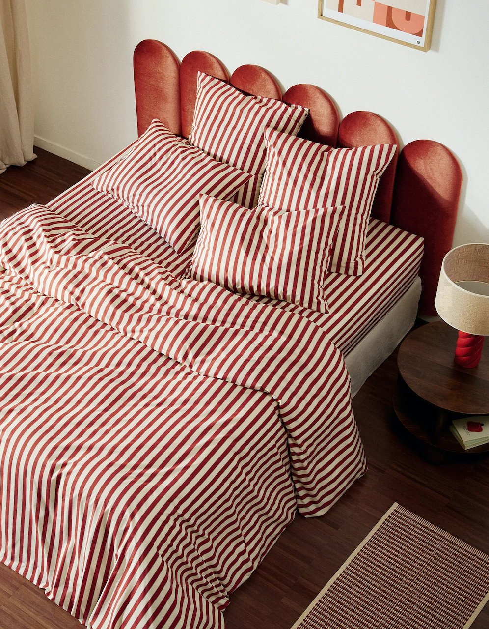 Dans la chambre, Noël ne s’affiche pas, il se suggère. Les draps rayés de rouge et de blanc suffisent à poser le ton ; le reste n’est que subtilité. Un coussin en peau de mouton installé sur le fauteuil, une bougie saveur Marrons Glacés posée sur la table de chevet ou encore une couverture en laine écossaise en jeté de lit signent l’esprit des Fêtes avec délicatesse. Mais pour bousculer cette sobriété, on ose quelques clins d’œil festifs, comme ces boules peintes à la main accrochées à la poignée de l’armoire ou un sapin en verre lumineux apportant la juste dose d’éclat dans la pièce.