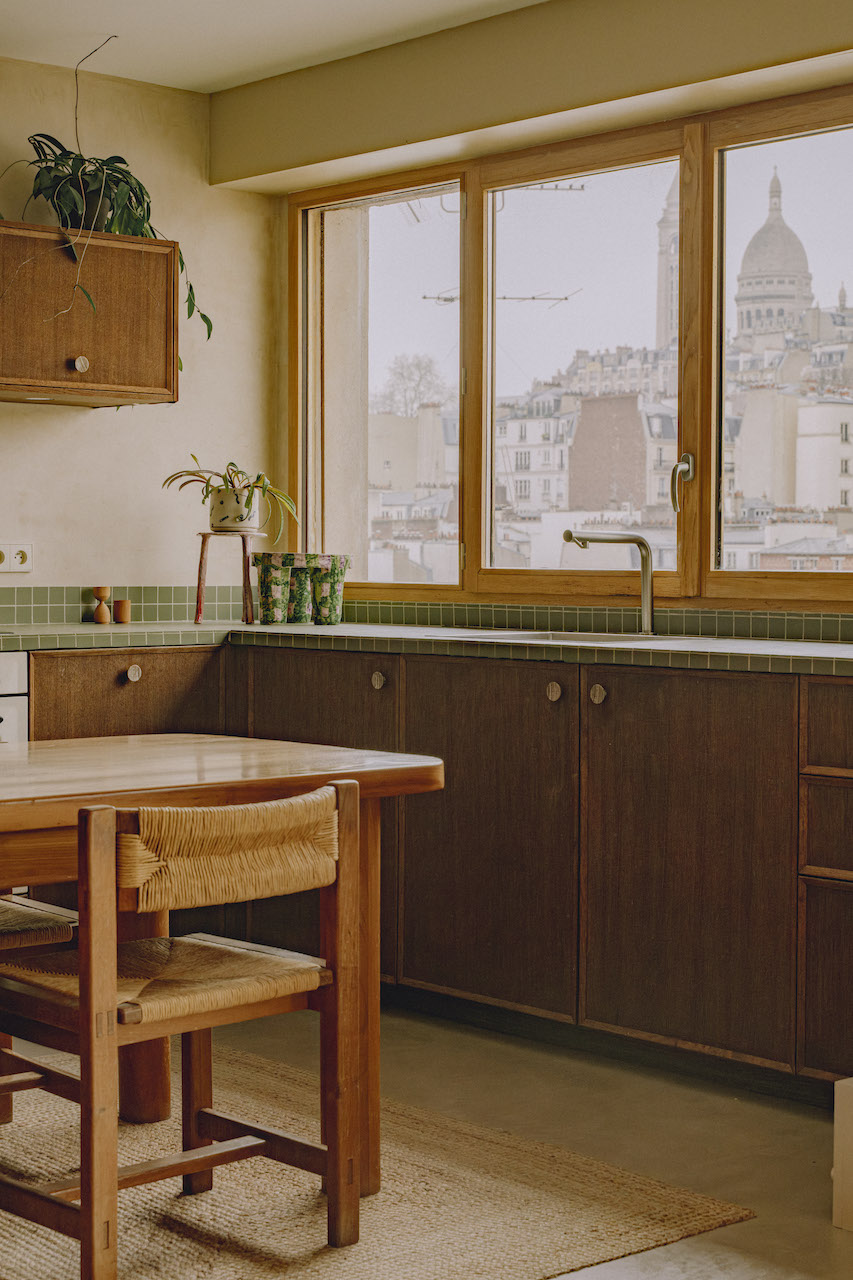 Écouter les personnes autant que les lieux, et les faire évoluer sans tout effacer : c’est dans cet esprit qu’Inès a rénové cet appartement des années 1970, situé au sommet d’un immeuble du 18e arrondissement, pour y vivre en famille. Après un détour par le 10e arrondissement, Inès et son mari Ambroise ont eu envie de retrouver leur quartier de prédilection et découvrent cet appartement par hasard. « On est tombés sur une annonce du Bon Coin. Les photos étaient peu flatteuses, surtout celles de la vue sur le Sacré-Cœur, que l’on devinait à peine. L’appartement était dans son jus, mais on a tout de suite senti le potentiel. On a mené notre petite enquête pour comprendre de quel côté de la butte Montmartre on se situait, et on a foncé. »