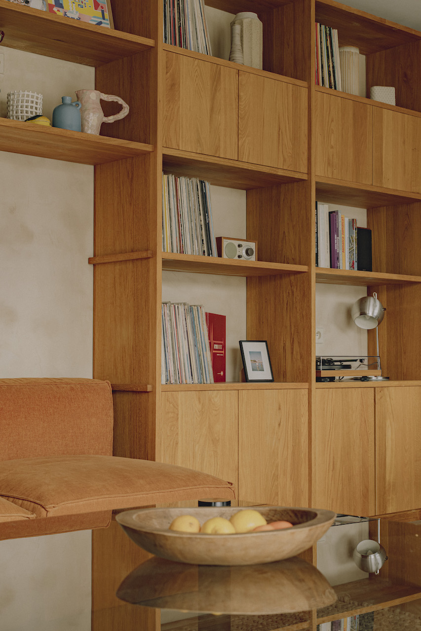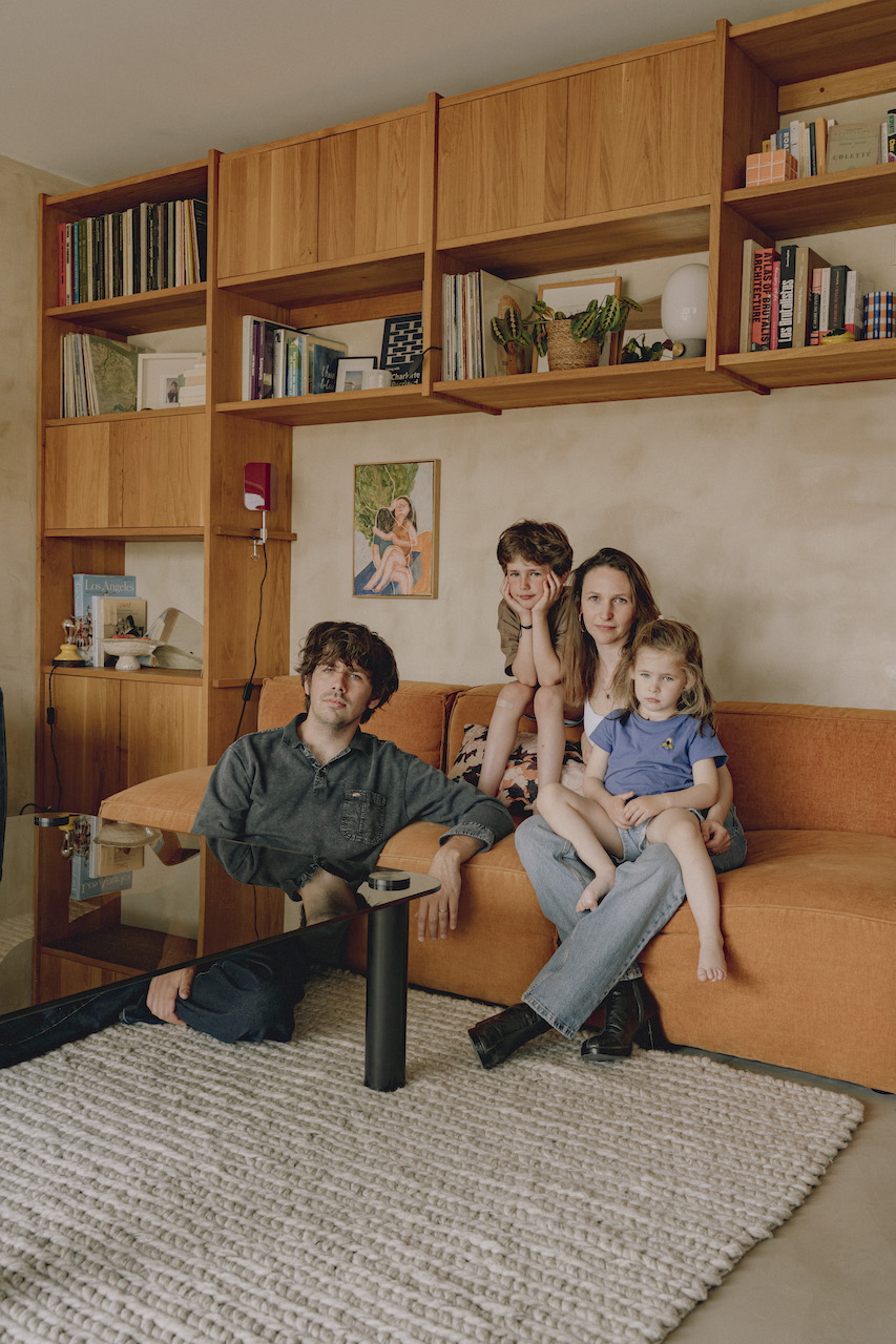 Si les murs sont tombés pour ouvrir l’espace et l’inscrire dans une écriture contemporaine et beaucoup plus fonctionnelle, Inès s’est appuyée sur les années 1970 comme fil conducteur, notamment à travers le choix des matériaux et le soin porté aux détails. « Je souhaitais absolument préserver ’ADN de l’immeuble et faire en sorte que l’on en retrouve des clins d’œil dans l’appartement. » Dans le salon, la grande bibliothèque dessinée par l’architecte assume une présence presque brute, en écho au bois du hall d’entrée. L’un des sols de salle de bains reprend les carreaux rouge brique du balcon. Pour harmoniser l’ensemble sans céder à une esthétique haussmannienne, les matériaux jouent un rôle essentiel : le sol est en béton ciré dans une teinte gris chaud, tandis que les mursx sont recouverts de peinture à la chaux. Un esprit “cosy” que l’on retrouve également dans le choix de la moquette, qu’Inès n’a pas hésité à installer dans les chambres. « J’adore la moquette, je trouve ça extrêmement confortable, surtout pieds nus. Et puis les enfants vivent beaucoup par terre. J’aime l’idée d’avoir un appartement cocon. »