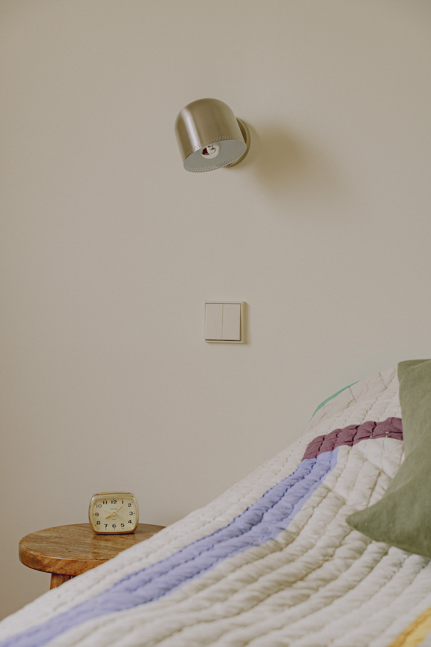 Des volumes modernistes, des teintes et des textures organiques : sur cette toile de fond, Inès a composé un répertoire décoratif où le sur-mesure rencontre des meubles et luminaires chinés avec patience, où quelques touches de couleur et des pièces arty donnent au lieu sa singularité. Volontairement enveloppante, l’entrée se teinte d’un rouge profond, presque théâtral. La cuisine, en total look noyer souligné d’un carrelage vert, assume un esprit rétro et se déploie autour d’une grande table vintage en bois. Ailleurs, les fonctions des meubles se détournent : un buffet de salon devient meuble-vasque dans la salle de bains, des tabourets font office de table de chevet…