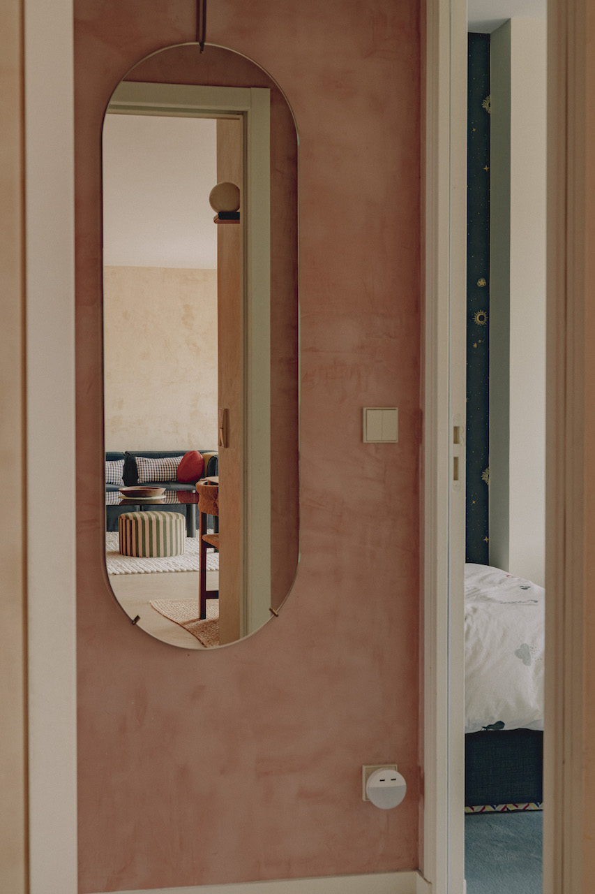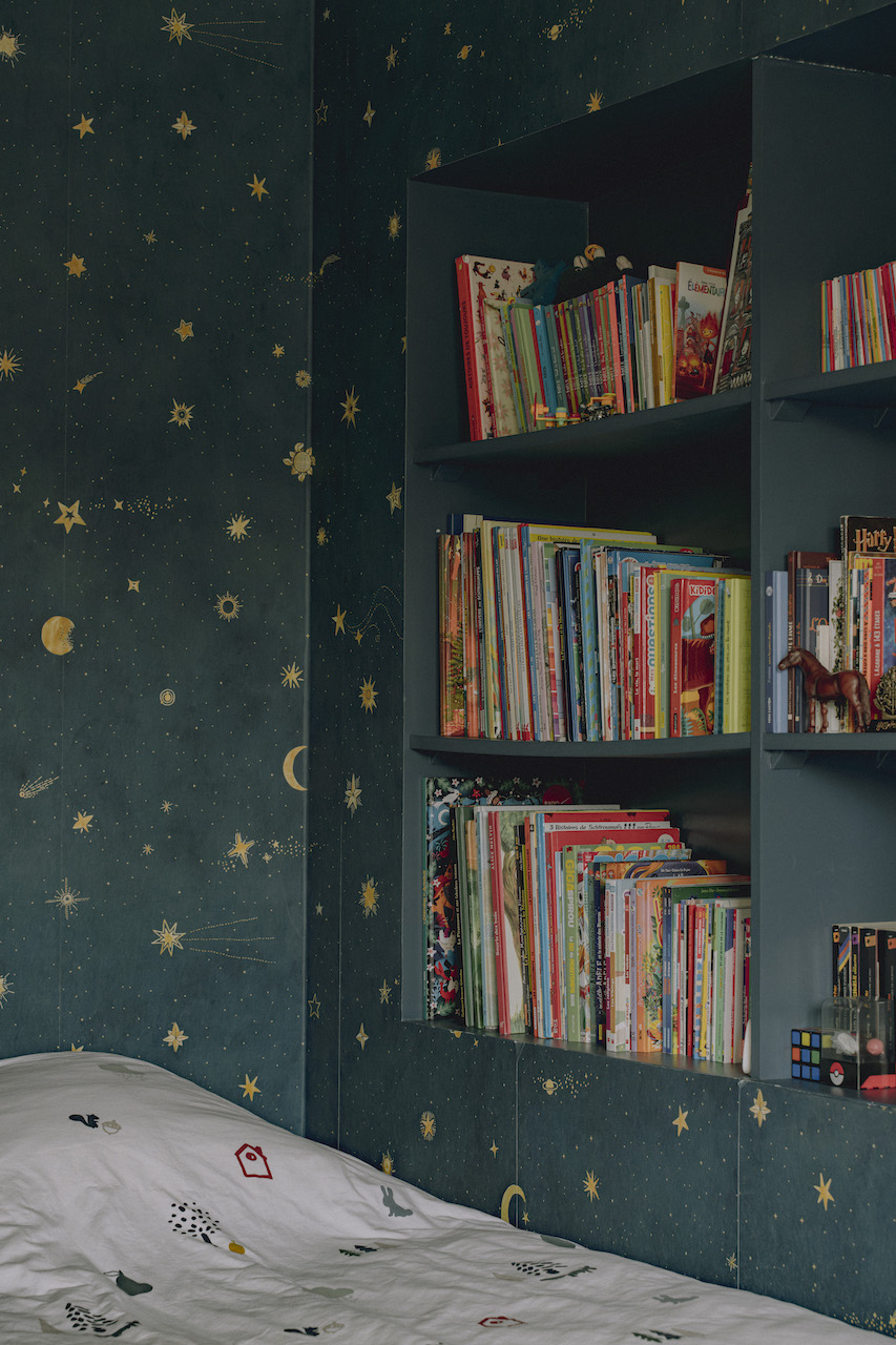 Niché au 10e étage, l’appartement était très cloisonné, composé de nombreuses petites pièces ; un plan typique des années 1970, dont la structure – avec peu de murs porteurs – a permis une transformation significative. Inès en a donc profité pour abattre les cloisons, redéfinir les espaces ainsi que la circulation et ouvrir une grande pièce de vie baignée de lumière, réunissant cuisine, salle à manger et salon. Au centre de l’appartement, elle donne accès d’un côté aux chambres des enfants – Marcel et Solange –, de l’autre à celle d’Inès et Ambroise. « Deux ans plus tard, le voisin a vendu son appartement. Cela nous a permis d’aménager une suite parentale mais aussi mon bureau, situé au même étage tout en étant totalement indépendant de l’appartement. J’ai donc tous les avantages d’un bureau à deux pas, sans les inconvénients. »