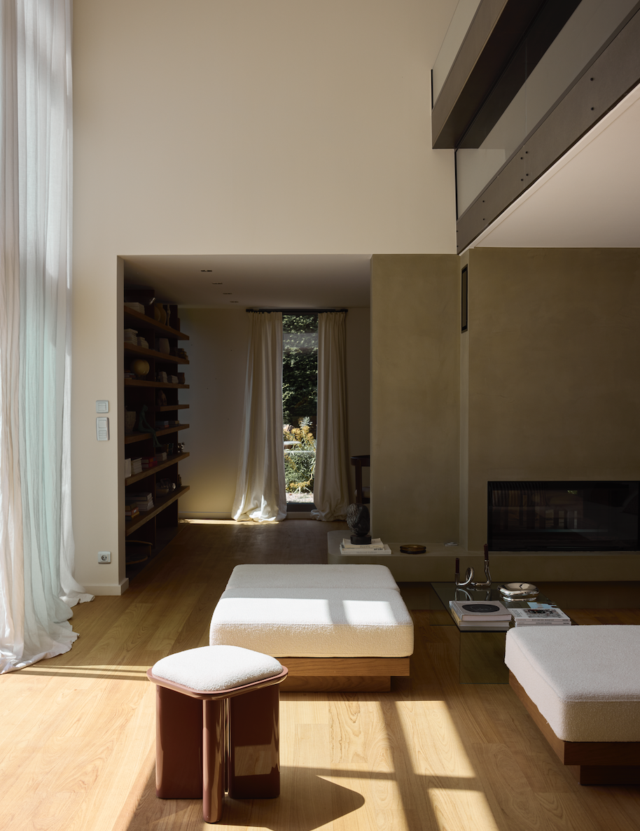 Comme le dit si bien la baseline de Gabrielle Paris, la maison de Julie et Alexandre s’inspire de leur vie de famille et évolue au fil du temps selon les envies et les besoins de chacun. Le rez-de-chaussée, très ouvert et baigné de lumière grâce aux grandes baies vitrées, a clairement gagné en chaleur et en fluidité. Dans le salon, la magnifique cheminée enduite de béton ciré fait le lien avec la salle à manger grâce à l’insert double face. L’étage a longtemps accueilli les chambres de toute la famille ; maintenant, c’est le domaine réservé des ados. Après avoir occupé l’une des chambres à proximité de leurs enfants, Julie et Alexandre sont redescendus pour investir la suite parentale existante au rez-de-chaussée (qui a fait office de bureau pour Gabrielle Paris pendant plusieurs années !). « Les enfants grandissent et il faut s’adapter. Avec mon métier, je suis sensible aux belles choses mais j’ai surtout envie d’une maison facile à vivre. J’ai de la chance parce que mes enfants s’intéressent à la décoration et à ce que je fais. Ils se sont impliqués dans les choix pour leur chambre », partage Julie. Avec son allure de studio design, la chambre de Lilas, 17 ans, est agencée de façon cosy avec un mini-salon et une salle de bains au même niveau, surmontés par une mezzanine où se trouve son lit.