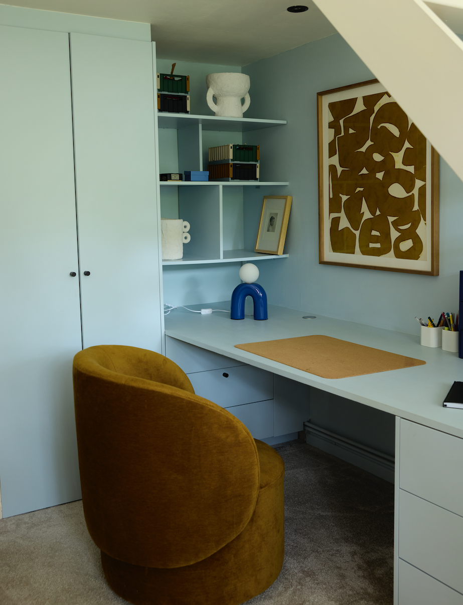 Chez les garçons, il a fallu jouer avec la même implantation pour apporter du rangement sans oublier le confort. Julie a utilisé la couleur pour leur créer à chacun un univers différent : kaki pour Auguste, 15 ans, et bleu ciel avec des touches de jaune pour Ambroise, 10 ans. « On a voulu conserver un aménagement le plus sobre possible avec un espace bureau-dressing optimisé », précise-t-elle. Réalisé en semi-mesure sous l’escalier qui mène au coin nuit, cet espace donne le ton à chaque chambre, véritable paradis pour ado. Accompagné par l’architecte d’intérieur Julia Vancostenoble, le couple a également procèdé à la réno- vation de la suite parentale avant de s’y installer. « J’ai un avis bien arrêté et mon mari aussi, donc on avait besoin de son aide pour se mettre d’accord ! Nous avons travaillé sur les plans ensemble et revu complètement l’espace pour imaginer cette suite spacieuse et lumineuse. Je l’adore, j’ai l’impression d’être à l’hôtel ! » La verrière offre une séparation visuelle entre la chambre et la salle de bains, tout en laissant la lumière et le regard circuler. En dessous, le meuble de rangement sur- mesure fait le lien avec la baignoire de l’autre côté grâce à ses lignes courbes. « La maison est très moderne et j’avais envie d’arrondis pour ramener du contraste et de la rondeur. »