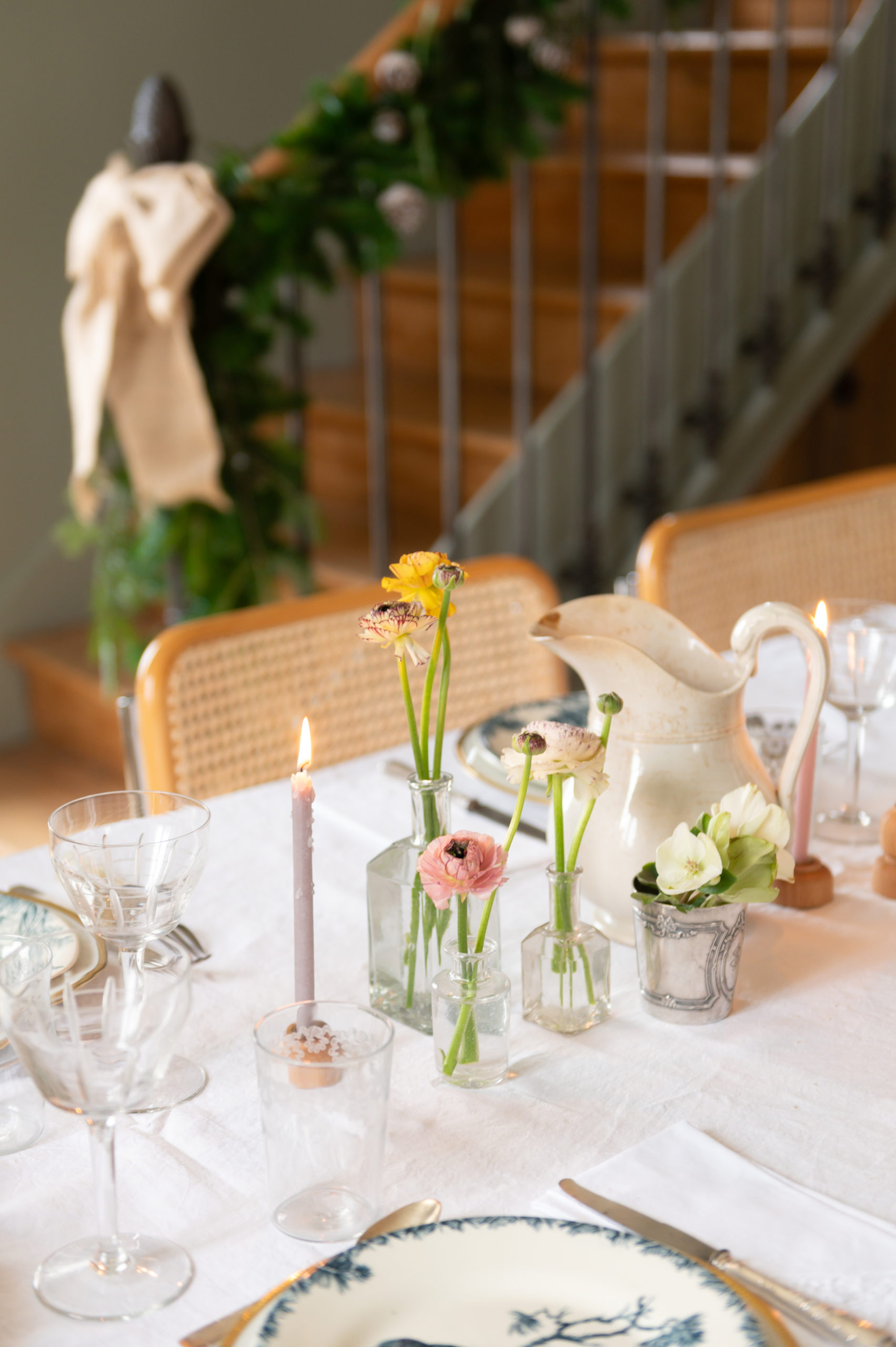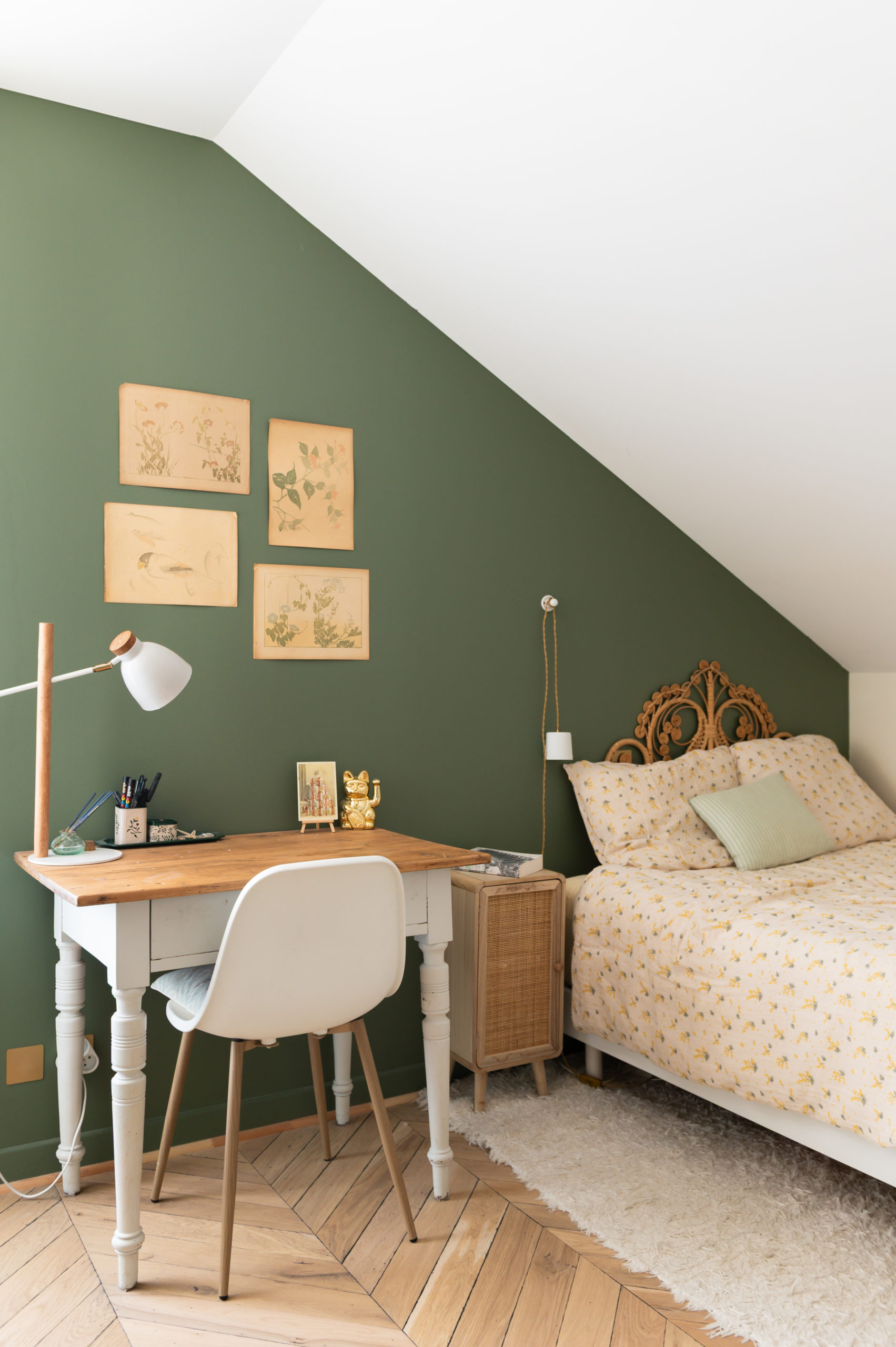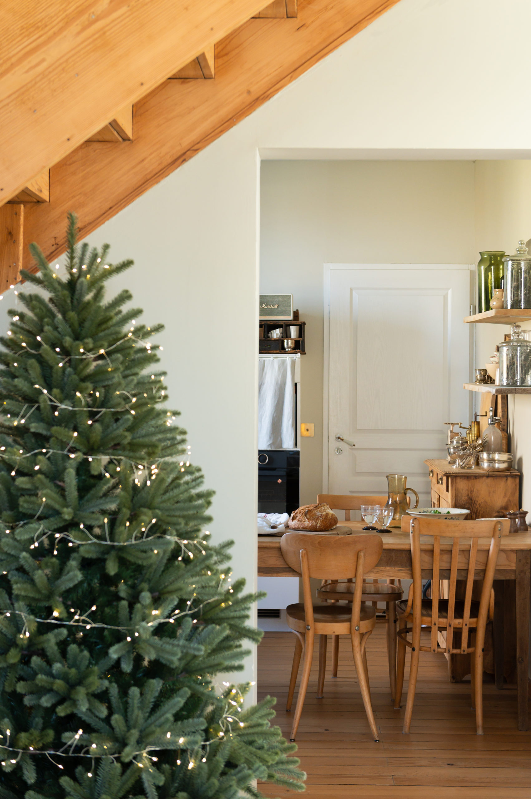 Chaleureuse et enveloppante, la déco- ration associe les matériaux naturels comme le bois, le lin et la terre cuite. La palette chromatique de la maison se déploie avec la même justesse dans des nuances délicatement surannées : beige mastic, vert feuillage, gris-bleu discret… À l’étage, Julia fait appel aux conseils couleurs d’un consultant professionnel pour choisir la teinte vert bronze qui habille la chambre parentale du sol au plafond. Ce parti pris audacieux donne une dimension sophistiquée à ce petit nid sous les toits, en opposition parfaite avec la salle de bains, d’un blanc immaculé. Pour agrémenter l’espace, Julia compose un peu partout des mises en scène avec les beautés patinées qu’elle a chinées, des objets de créateurs choisis avec soin et des fleurs, toujours. Ce décor au charme réconfortant connaît son point culminant à l’approche des Fêtes de fin d’année. La pièce à vivre, déjà particulièrement cosy, se pare petit à petit de ses habits de lumière, pour le plus grand bonheur des parents et des enfants. « On est très Noël ! On installe le sapin début décembre puis les guir- landes arrivent au fur et à mesure, sur la cheminée, sur l’escalier… et cela monte crescendo jusqu’au réveillon ! Toujours avec un feu de cheminée, des chants de Noël, un bon film ou des jeux de société… C’est une période ultra-cocooning où l’on savoure chaque instant passé ensemble », sourit Julia.