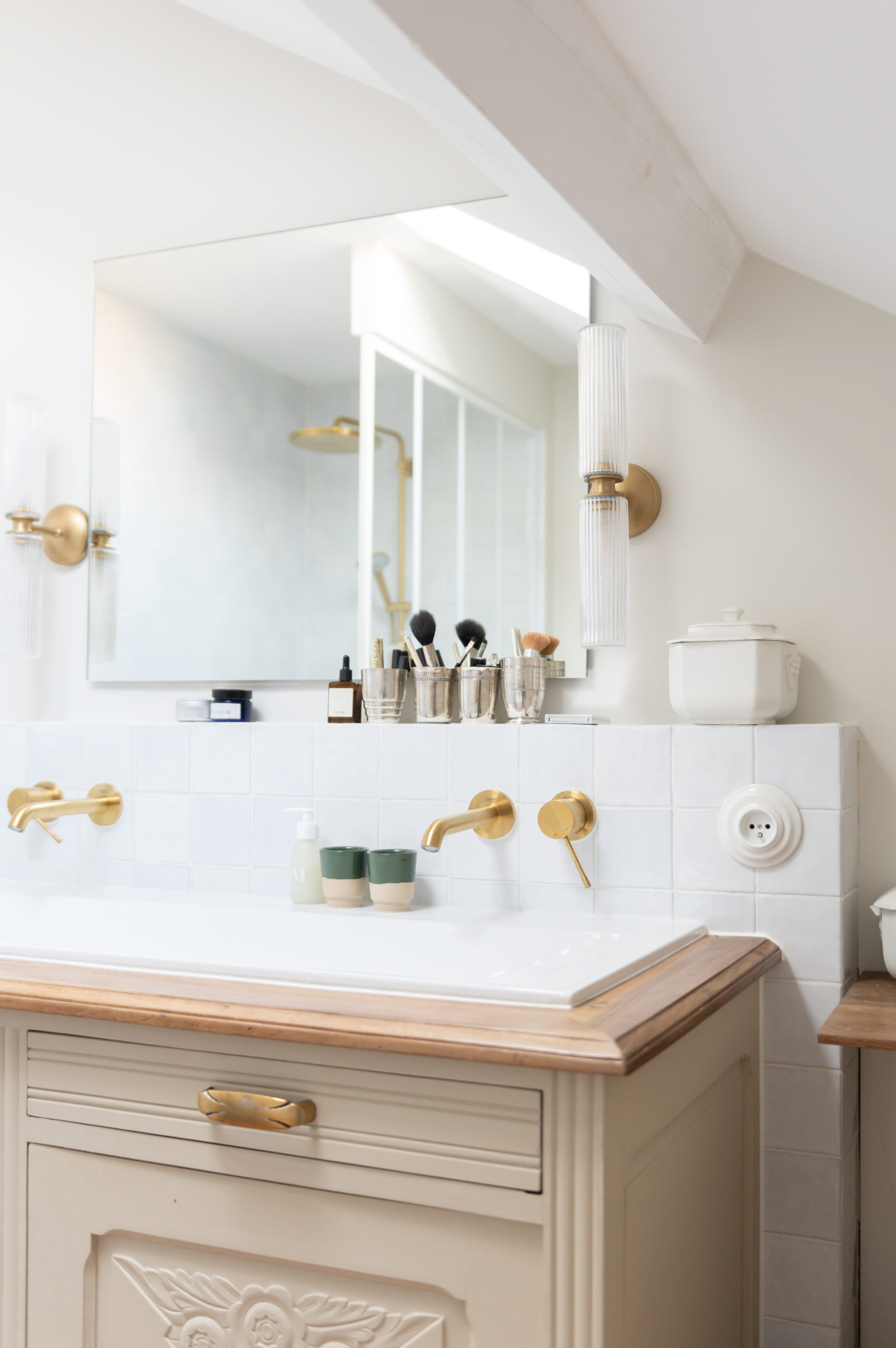 Chaque pièce de la maison possède une pièce chinée phare donnant le ton à l’atmosphère : la commode anglaise dans la suite parentale, le meuble à casiers dans la chambre de Jeanne ou le vaisselier dans la salle à manger. Et quand elle ne chine pas, Julia sait trouver le cachet de l’ancien dans le neuf, comme pour la baignoire Admiral de la salle de bains ou les interrupteurs en laiton massif sur les murs.