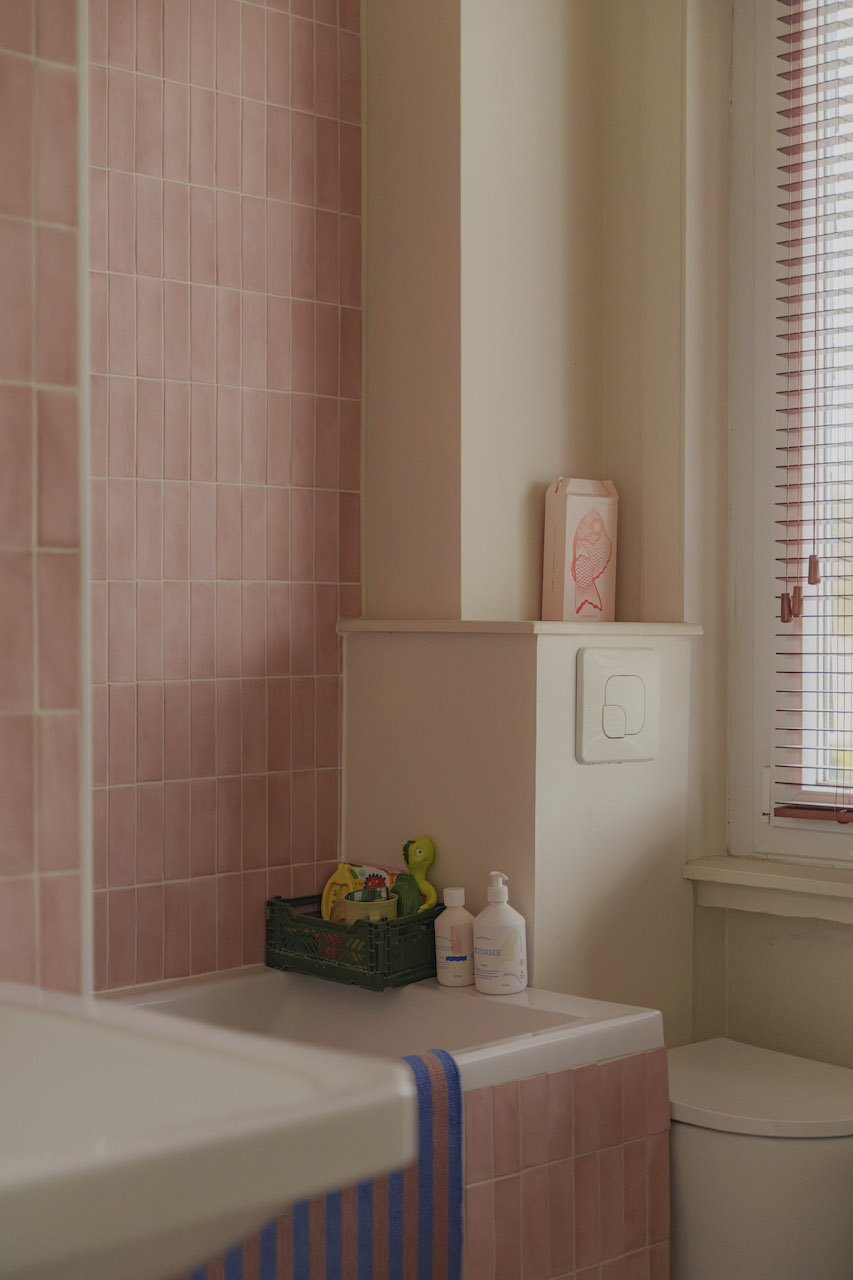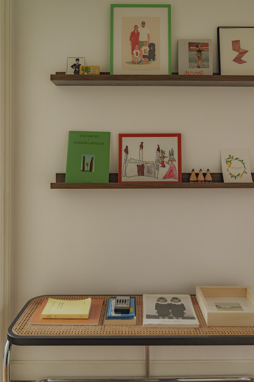 Directrice artistique freelance, Diane accompagne ses clients sur la création de leur identité visuelle, et notamment sur la partie shooting photo. Son métier « collaboratif et très humain » l’inspire jusque dans son intérieur, ponctué de créations colorées de ses clients : papier peint Mathilde Cabanas dans la chambre des enfants, tabouret Axel Chay ou applique Violaine d’Harcourt dans le salon… Avec le même enthousiasme, elle expose aussi les dessins de ses enfants, dont les encadrements habillent allègrement les murs. « Pio prend des cours de dessin tous les mercredis. Il est vraiment créatif et il adore les couleurs ! J’ai très vite eu envie de décorer la maison avec ses petites œuvres d’art et celles de son frère. Cela fait un joli souvenir et les enfants sont fiers », sourit Diane. On dirait bien que la relève est assurée.