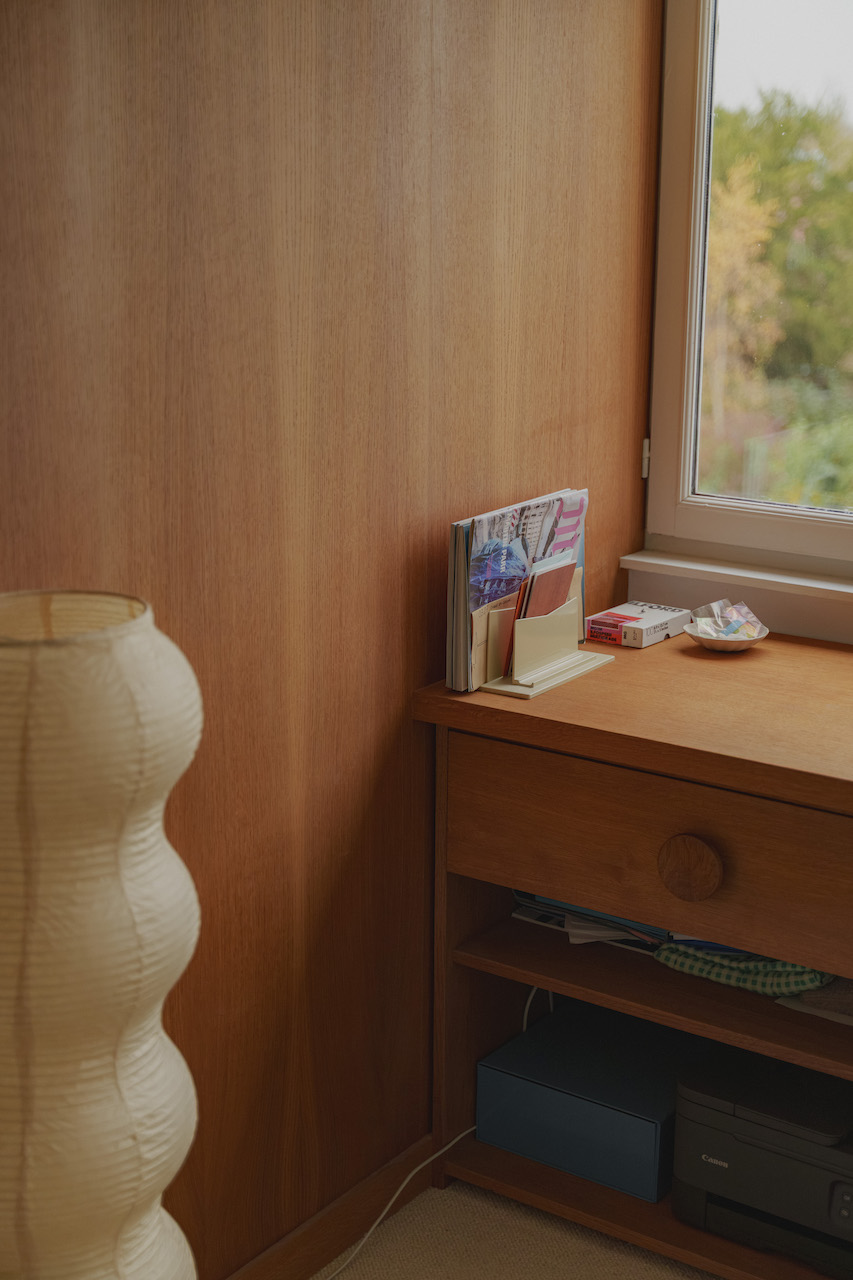 Le dernier étage de la maison, auparavant une chambre parentale quelconque, a été transformé en une pièce chaleureuse habillée d’un mur en bois sur mesure et de moquette bouclette au sol. « J’ai tout de suite adoré la vue, c’est lumineux, très haut et très vert. On surplombe plusieurs jardins et le nôtre. Aujourd’hui, c’est mon bureau mais c’est aussi une chambre d’amis, la salle télé et la salle de jeux des enfants. Ils peuvent laisser leur bazar ici, je ne leur demande pas de ranger ! C’est vraiment une pièce que j’adore, toujours vivante mais aussi hyper-réconfortante, avec un esprit cabane. J’ai préféré placer mon bureau face aux fenêtres, plus inspirant que face à un mur selon moi ! »