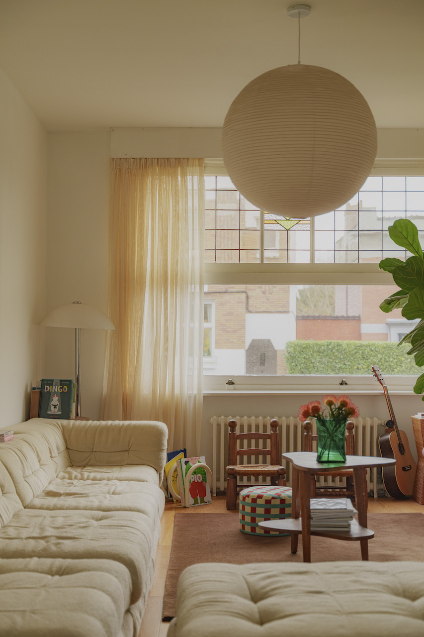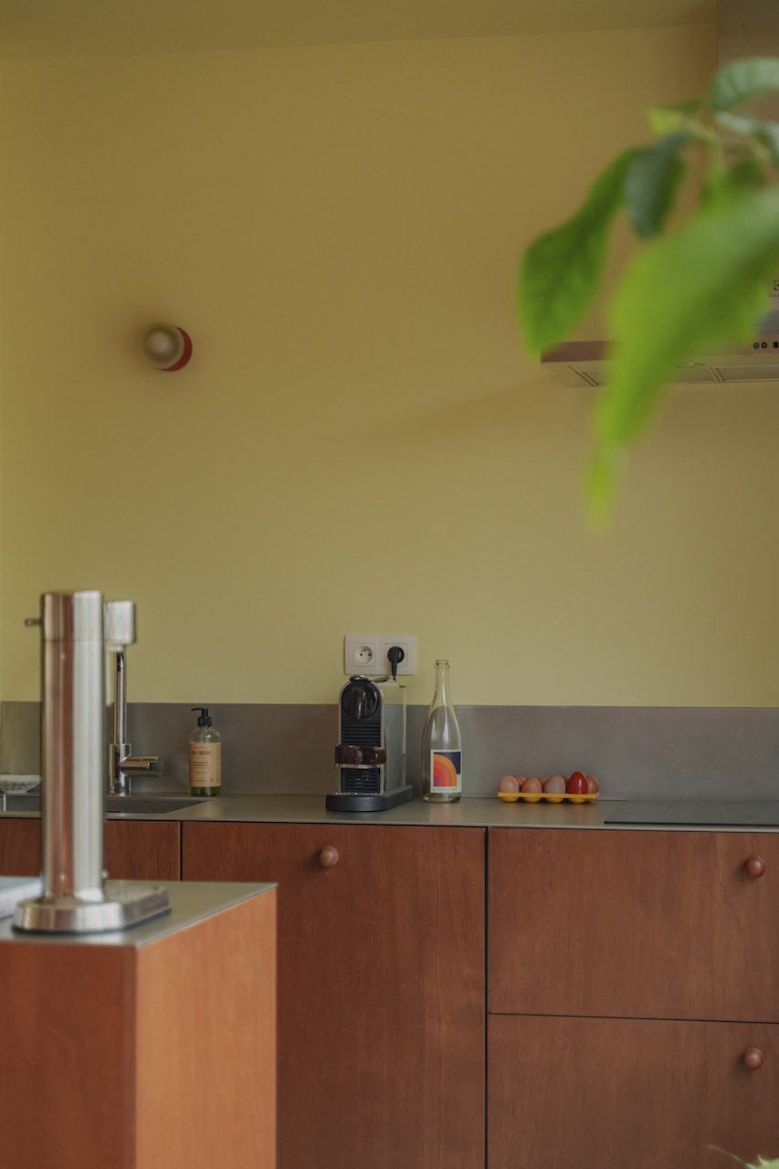 Toute en hauteur, cette maison bel-étage caractéristique de la métropole lilloise se répartit sur quatre niveaux. Au rez-de-chaussée, le garage a été transformé en bureau pour Cyprien. Quelques marches plus haut, la pièce de vie traversante donne au-dessus de la rue (et forme le point de vue idéal pour les garçons qui observent régulièrement ce qui se passe dehors !). Ce niveau accueille à la fois le salon, la salle à manger et la cuisine. Dans le salon, le grand canapé seventies chiné juste avant l’emménagement a donné le ton à une atmosphère calme et confortable. Diane y a privilégié les teintes neutres pour mieux les réveiller avec des touches de couleurs vibrantes. Elle a choisi la suspension boule, à la fois légère et sculpturale, pour qu’elle se voie de l’extérieur. « Allumée, elle ressemble à une lune et ça me plaît de savoir que nos amis ou nos voisins la regardent en passant », précise-t-elle. Pleines de charme avec leurs petits vitraux Art déco d’origine, les fenêtres du salon ont été conservées et contrastent élégamment avec les objets de design contemporain. Juste à côté, la table à manger laquée rouge se fond parfaitement dans les tonalités chaleureuses des aménagements sur mesure. Omniprésent, le bois se distingue comme un fil conducteur dans la maison. « J’aime quand l’ensemble est cohérent et que la déco se répond dans un intérieur. » Le couple a favorisé des teintes plutôt foncées (okoumé dans la pièce de vie ou bouleau teinté dans le bureau) pour apporter chaleur et caractère à leur intérieur déjà très lumineux. Dans la cuisine, l’okoumé s’associe à l’inox brossé dans un aménagement aux lignes épurées. Le jaune vif lumineux des murs et du plafond vient compléter ce cocktail personnel pour créer un espace à la personnalité joyeuse et affirmée.