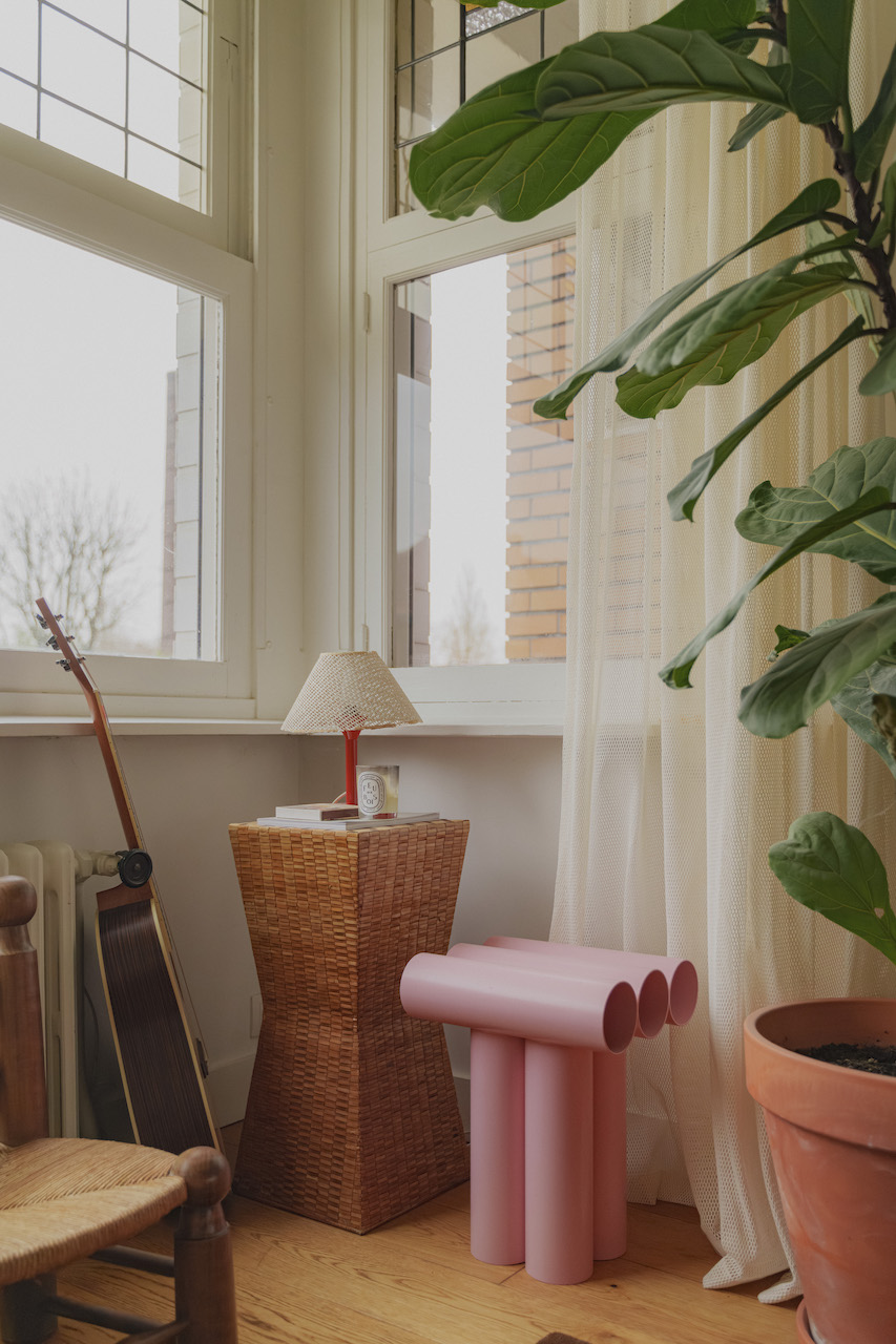 Le goût de Diane pour les associations de couleurs s’exprime pleinement à l’étage, dans les chambres des enfants notamment. Pour la chambre de Pio, 5 ans, le point de départ a été l’orange. « C’est une couleur que je lui associe depuis toujours, sûrement parce qu’il est né en octobre ! » Les aménagements semi-mesure ont été réalisés l’année dernière en partenariat avec Plum à partir des couleurs de la palette Colorama 2025. « Il s’agit de couleurs nées des inspirations de la communauté Plum. La sélection finale a été confiée à un jury de professionnels dont ma sœur Valentine (fondatrice de Room Service Studio, ndlr) faisait partie. La marque souhaitait mettre ces nouvelles couleurs en situation et nous avions justement besoin de revoir l’aménagement des chambres des enfants », explique Diane. Chez Pio, le meuble créé de toutes pièces offre de nombreux rangements, parfaits pour accueillir tous ses trésors. L’esprit seventies de ce cocon vitaminé se retrouve jusque dans la table de chevet qui appartenait à la maman de Diane quand elle était enfant.