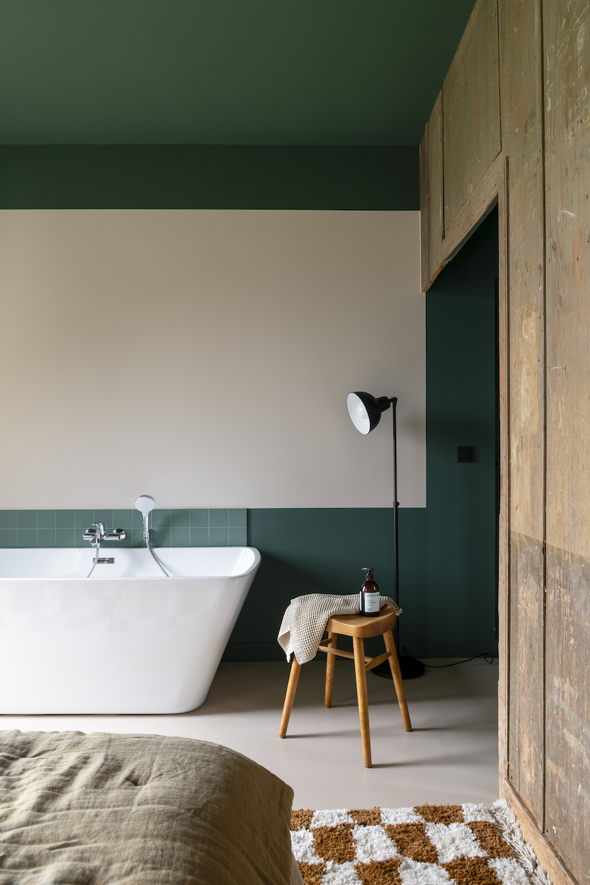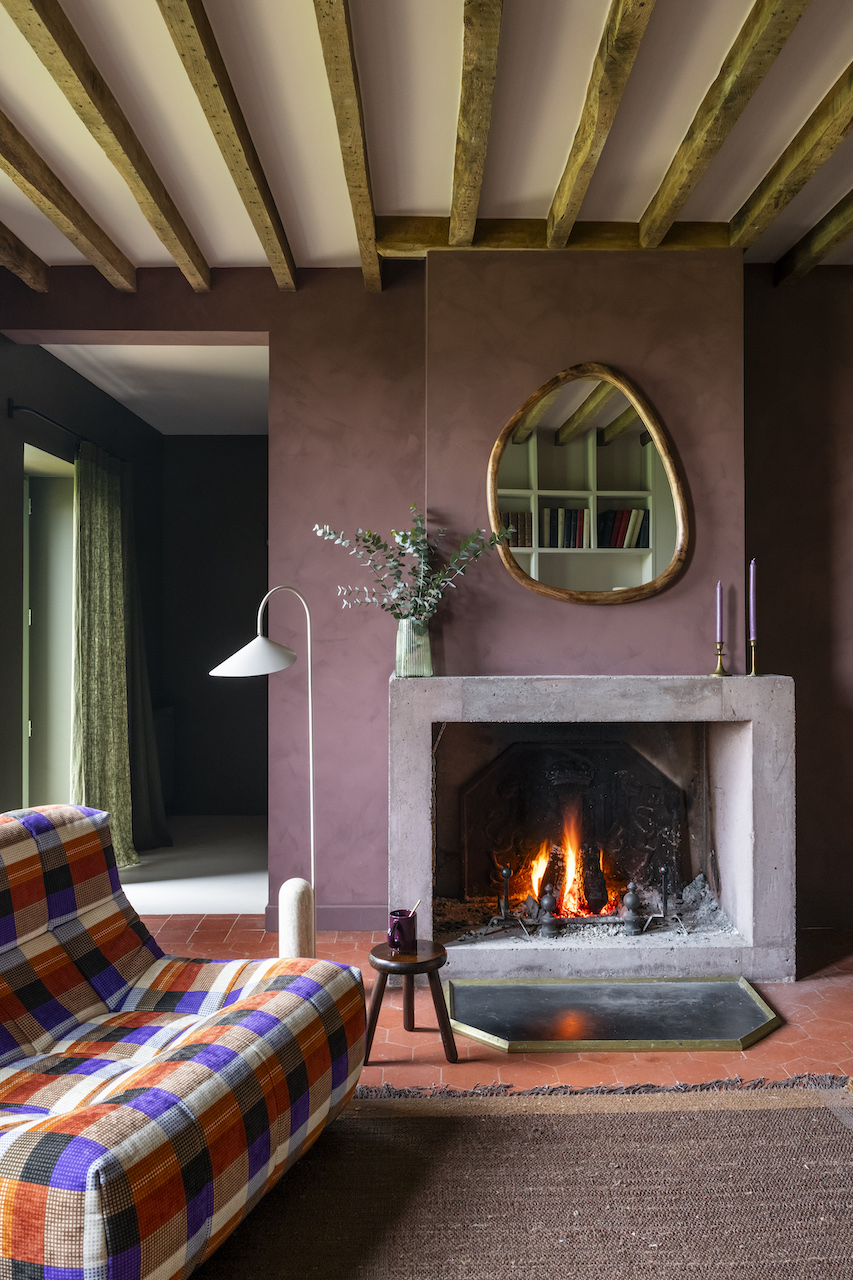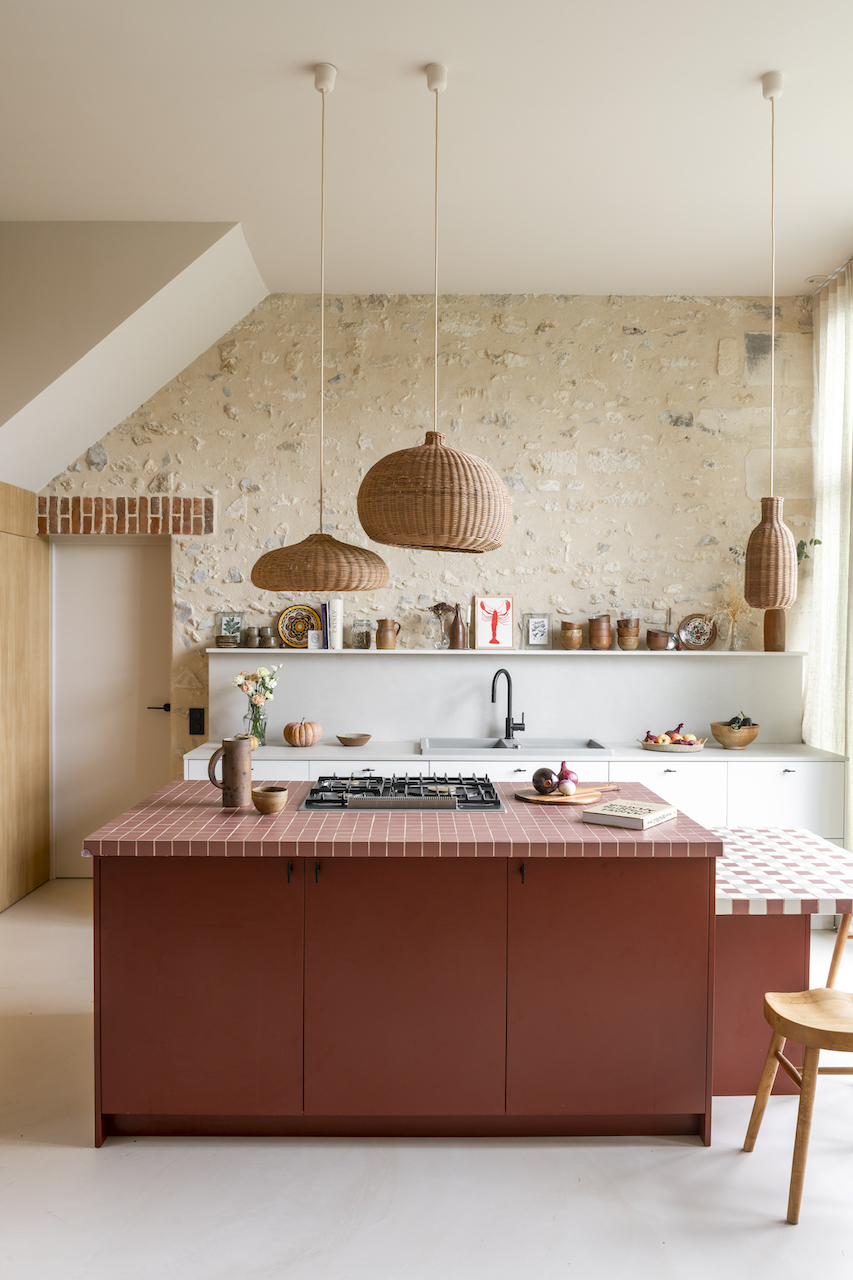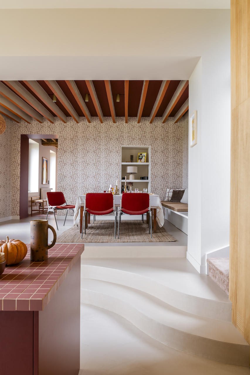 Autour de la cheminée, reconstruite en béton brut teinté, les assises moelleuses en velours invitent à la détente. L’ambiance est créée par des teintes intenses : du kaki réchauffé par du rose au plafond et de l’aubergine sur le conduit de la cheminée. Ces nuances trouvent écho dans la salle à manger où dominent les rouges et bordeaux, soulignés par un papier peint graphique aux touches brunes. « Nous avons imaginé la pièce comme une boîte intime et chaleureuse, contrastant avec les hauts volumes de la cuisine. Nous avons tiré parti de la différence de niveau entre les deux pièces en créant un léger dénivelé de trois marches arrondies, qui structure l’ensemble », ajoute l’architecte. La rénovation a été au-delà des attentes des propriétaires, tant la métamorphose est spectaculaire. « Nous ne pensions pas venir aussi souvent, mais la maison est tellement agréable, été comme hiver, que nous en profitons toute l’année… et nos amis aussi ! », se réjouit le couple.