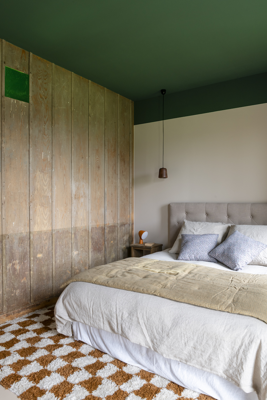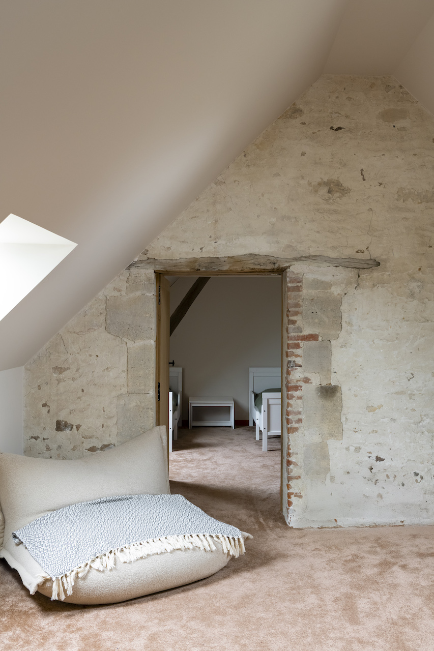De là, un passage a été créé pour accéder à la suite parentale, aménagée de plain-pied dans l’ancienne remise. La circulation a été réfléchie pour faciliter la vie quotidienne avec enfants et amis. Un escalier a été ajouté dans la cuisine afin de bénéficier d’un second accès à l’étage des chambres. « Comme souvent dans les longères, les chambres étaient en enfilade, et certaines traversantes », se souvient l’architecte. Ce nouvel escalier a permis de structurer l’étage en deux zones : la première accessible depuis la cuisine, dédiée à la famille, comprend les chambres d’enfants ; la seconde, réservée aux invités, dispose de trois chambres en enfilade.