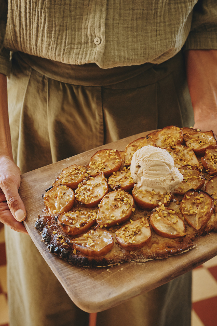 Préchauffez le four à 200 °C (th. 6/7). Coupez les poires en 2 et retirez le centre. Placez-les, faces coupées vers le haut, sur la pâte en laissant quelques centimètres de bord tout autour. Saupoudrez le tout de sucre glace et enfournez 30 à 35 minutes, jusqu’à ce que la pâte soit bien dorée et croustil- lante. Laissez tiédir 4 à 5 minutes. Faites chauffer la confiture dans une casserole (1-2 minutes), puis badigeonnez la tarte de confiture tiède (les fruits et la pâte). Parsemez le restant de pralin et régalez-vous !