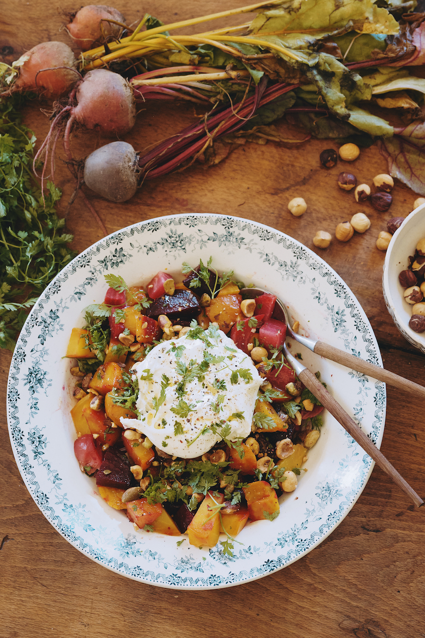 de pommée fumée et d’huile d’olive, parsemez de fleur de sel, d’un tour de moulin 5 baies, puis ajoutez les noix torréfiées et concassées. Terminez par un peu de cerfeuil ciselé, et si vous le souhaitez, quelques graines de grenade pour une touche de fraîcheur en plus. Servez sans attendre, tant que les betteraves sont encore tièdes.