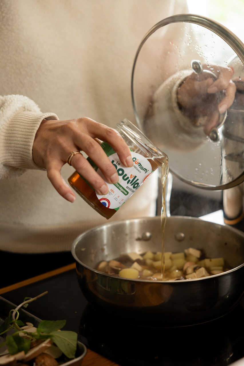 Aline Lebrène-Baron puise dans ses racines normandes l’amour du goût et du bien fait. Après une carrière dans le BTP, elle se réinvente en créant Good Food For Mama puis Oùmami, des bouillons naturels, sans additifs ni exhausteurs de goût, riches en collagène et en saveurs. Mijotés lentement pour extraire un maximum d’umami, ils sont préparés à partir d’ingrédients bio et français (os et légumes) pour être utilisés dans des sauces, risottos, soupes et plats mijotés.
