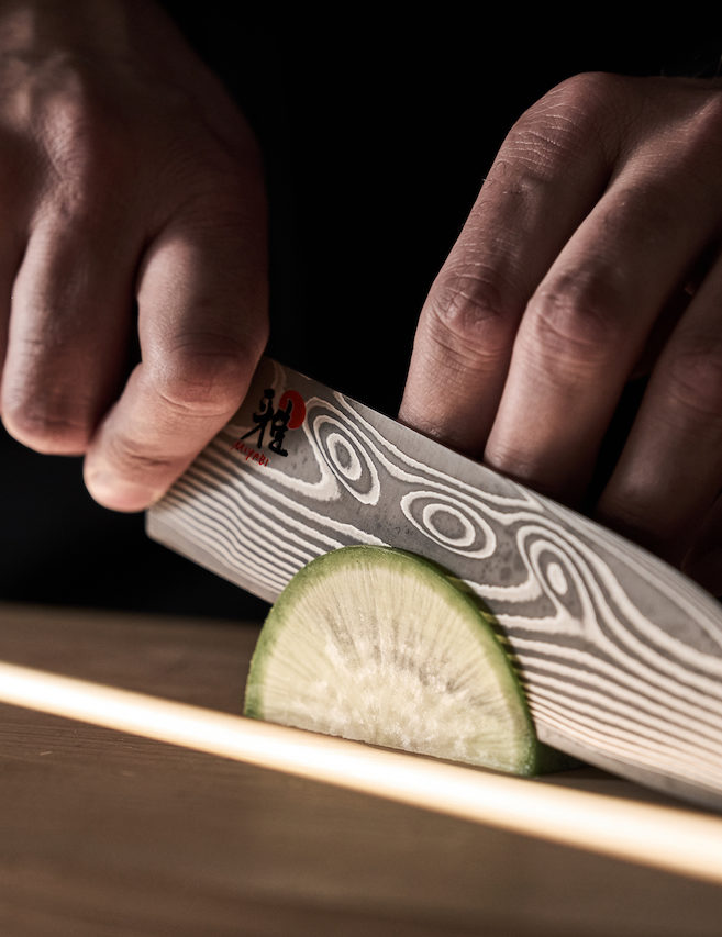 Posséder un couteau Miyabi, c’est convoquer le passé prestigieux des forgerons qui façonnaient les sabres des samouraïs. Tel un haïku, chaque lame prend forme avec équilibre, harmonie et sobriété. La découpe, verticale selon la tradition japonaise, contraste avec la gestuelle circulaire de la culture occidentale, révélant une philosophie et une approche différentes. Le manche joue un rôle essentiel. Le choix du bois, sa forme et sa marqueterie invitent à entrer en communion avec lamatière. Manche en cou de cygne, en D ou octogonal : chaque courbe est pensée pour offrir confort, équilibre et prise parfaite. La lame, quant à elle, se fait paysage, inspirée par la terre et la mer.