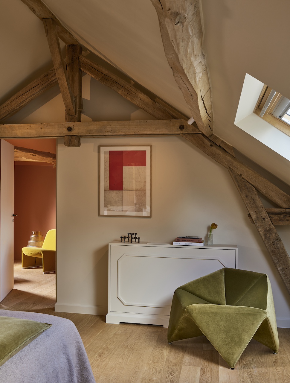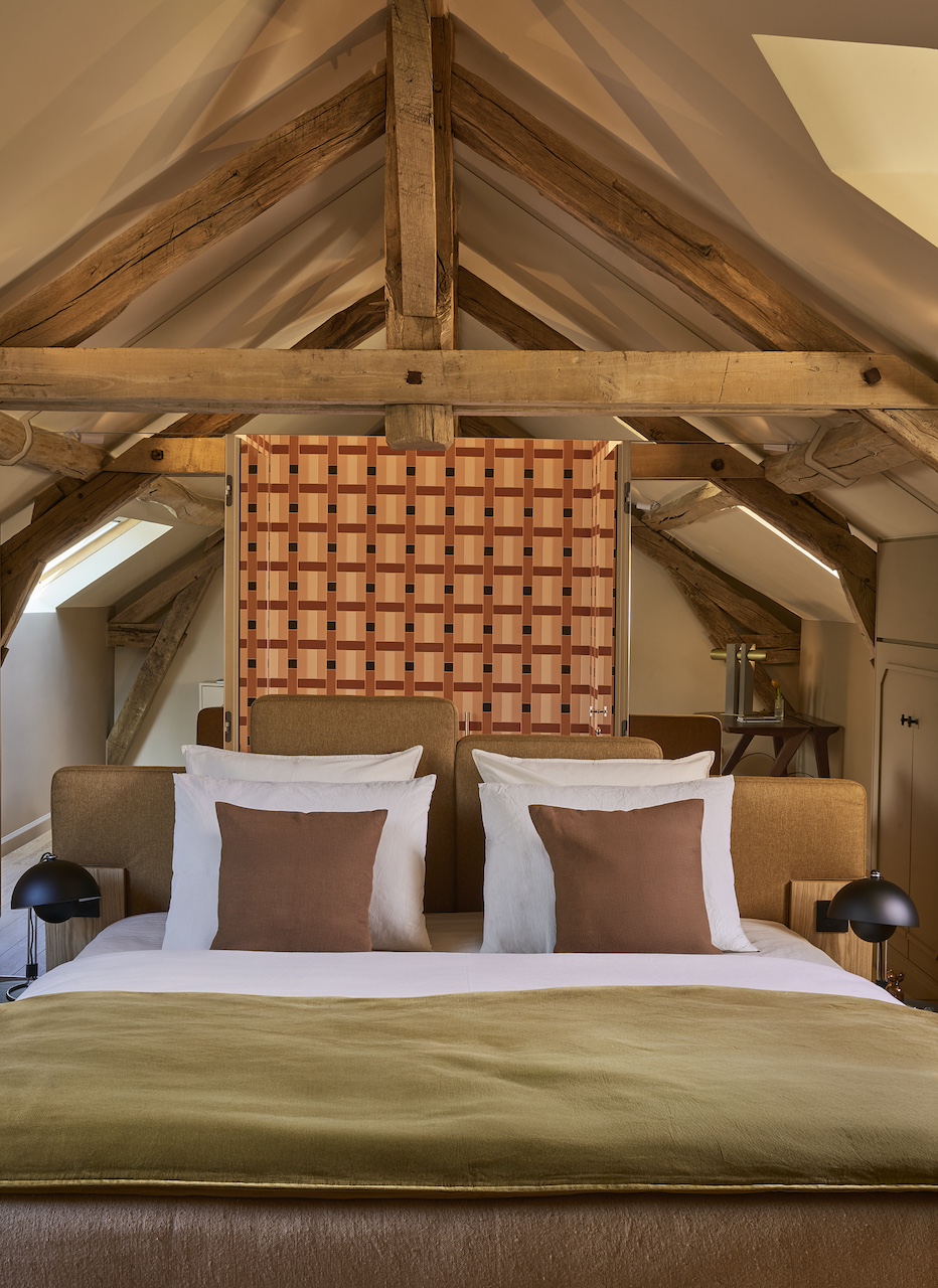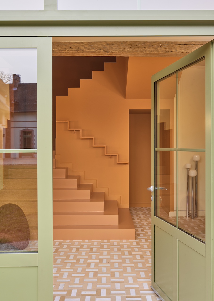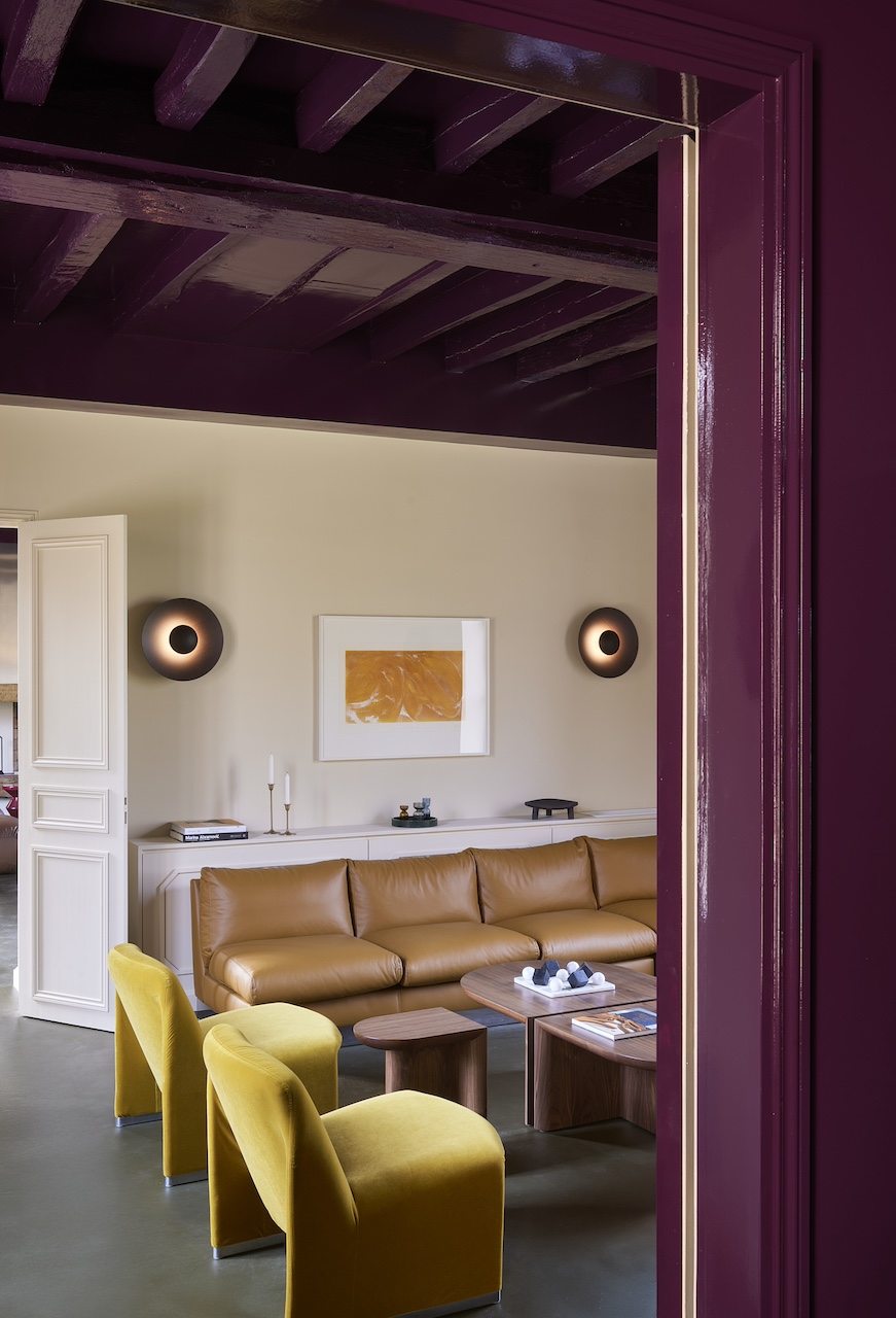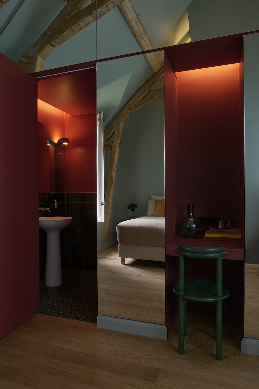 Situé à une heure de train depuis Paris jusqu’à Montargis, puis quinze minutes de voiture, l’évasion Monoamo sur deux jours se fait en toute simplicité. Le domaine s’étend sur près de 90 hectares, avec quatres bâtisses principales répartissant les usages : un lobby, une vingtaine de chambres (toutes différentes), des espaces de travail, des activités et loisirs… C’est Thibaut Picard, architecte, qui signe cette réalisation d’envergure. Habitué aux grandes enseignes hôtelières comme aux maisons particulières ou encore chambres d’hôtes à taille humaine, Thibaut met à contribution sa double casquette et y appose sa signature : de grands volumes assumés, des jeux d’angles et des couleurs franches. Avec Olivier, ils travaillent ensemble pendant deux ans sur une équation délicate, mais aussi LA clé du projet : « comment rendre un espace suffisamment grand pour un groupe sans qu’il bascule dans l’impersonnel ? »