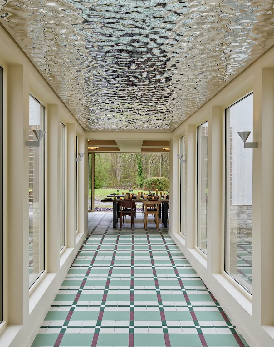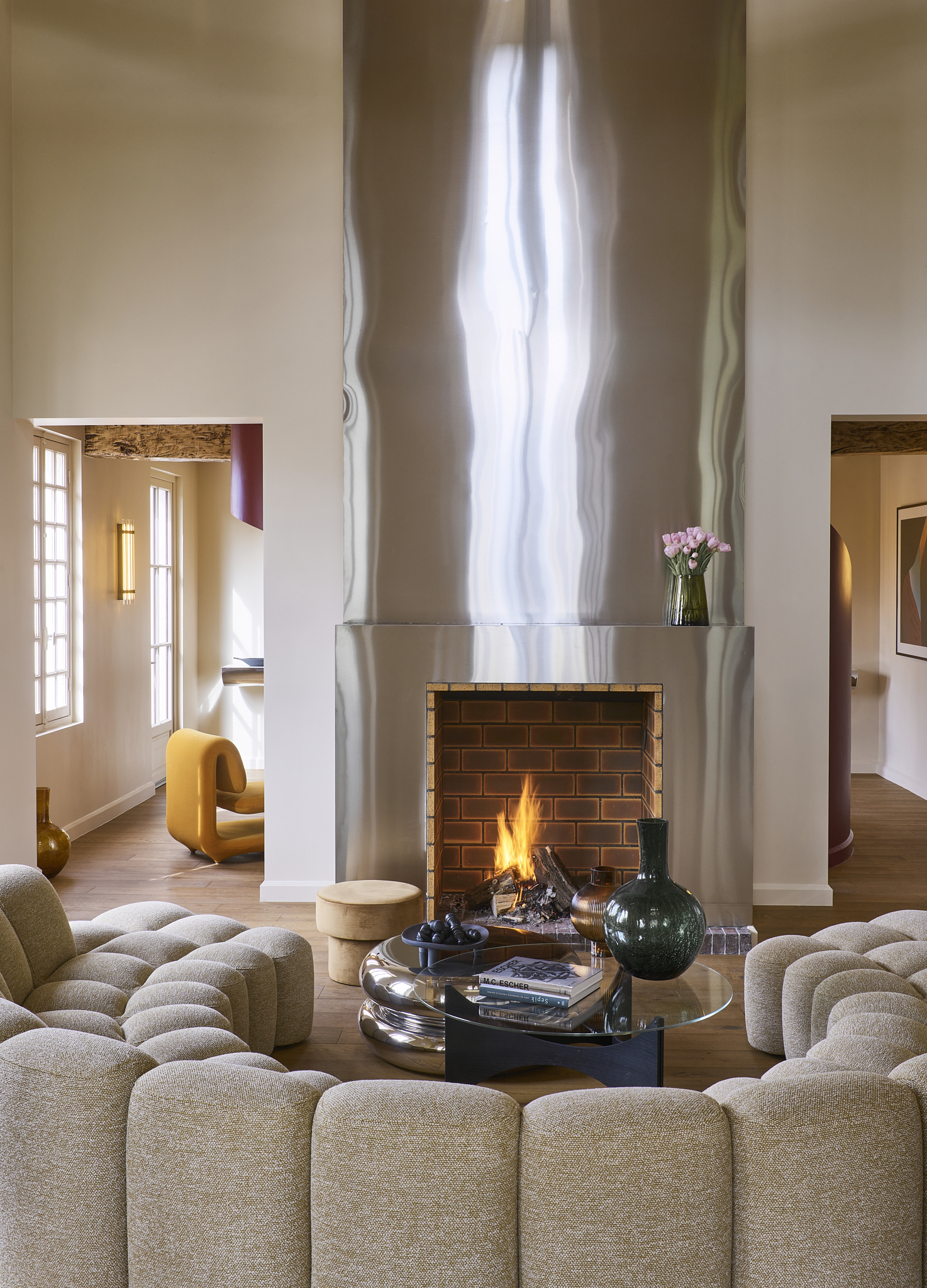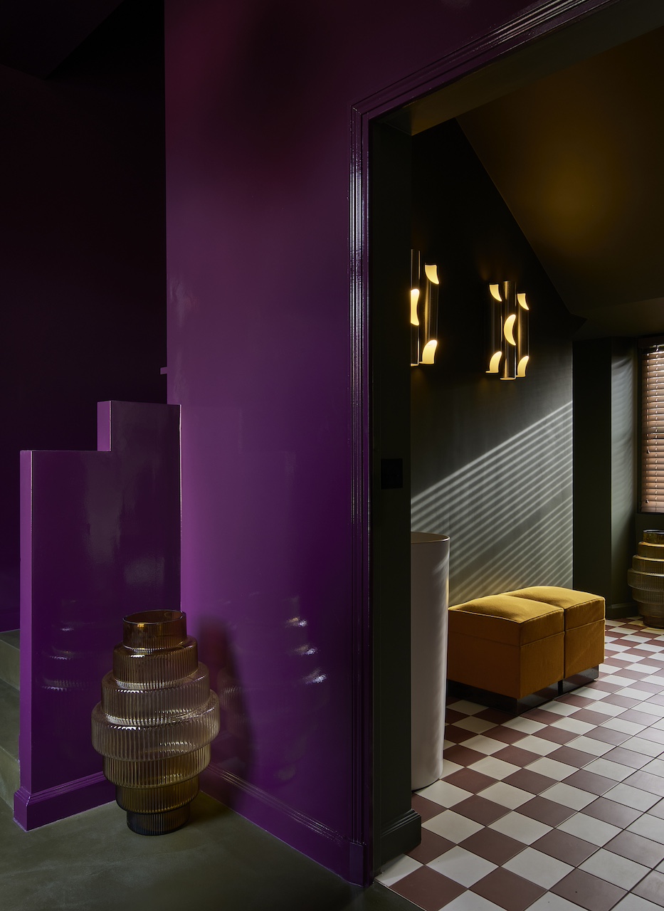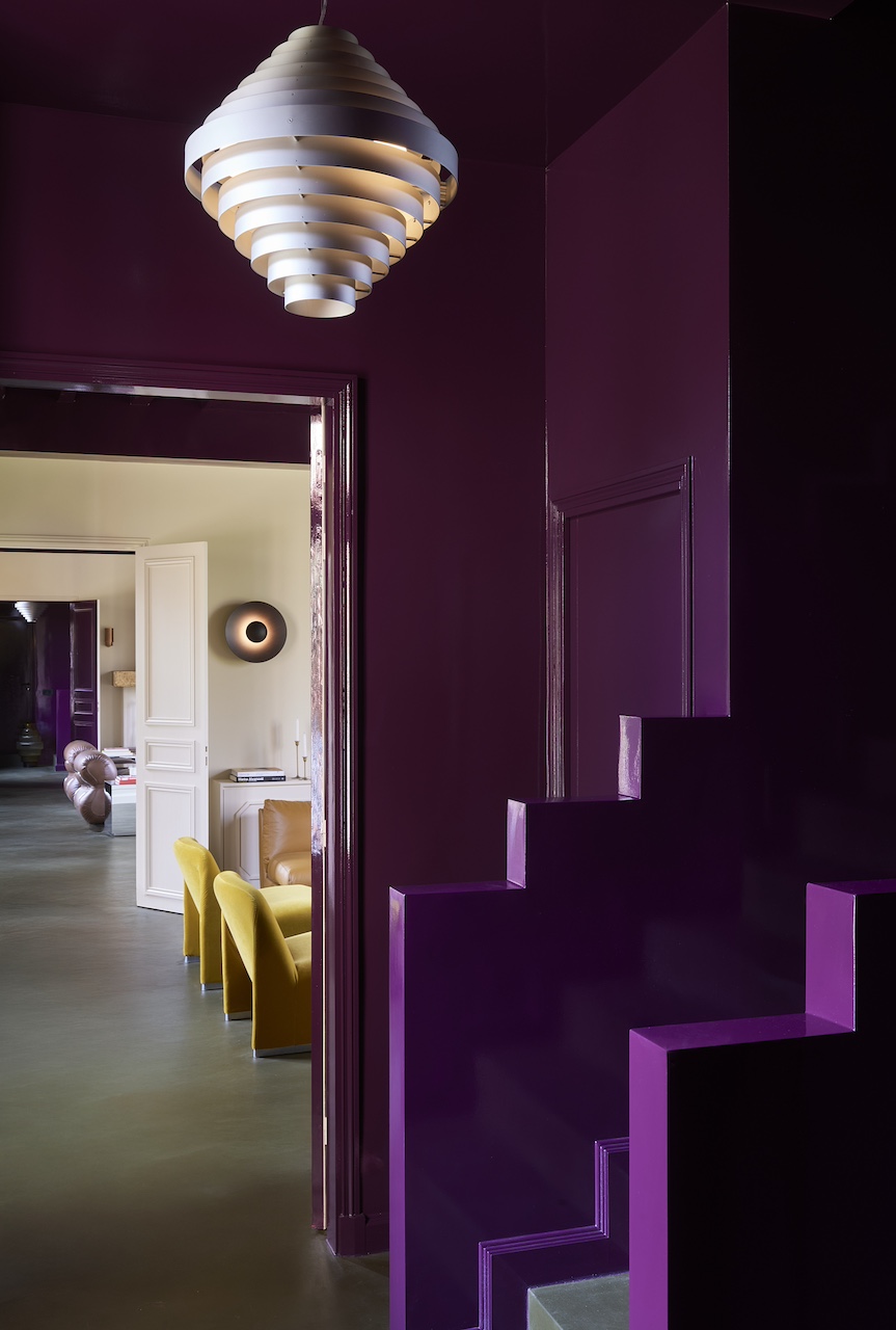 L’intérieur ne laisse pas indifférent, et ce dès l’entrée. Le prune laqué s’impose comme la couleur signature des espaces importants. Dans les salons, les couloirs, des murs et plafonds en aluminium jouent avec la lumière. Les poutres de l’ancienne bâtisse restent apparentes à certains endroits, rappelant ce qu’était le lieu avant, en dialogue avec un mobilier contemporain de grande taille, généreux. Partout, une attention portée aux petits détails : objets posés, petites décorations, livres, font que l’on se sent dans une maison habitée plutôt que dans un showroom.
