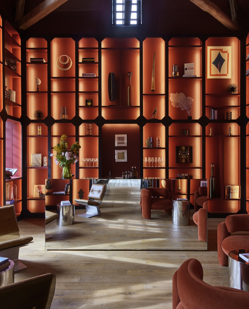 La pièce maîtresse reste la bibliothèque-bar à cocktail : tons rouges profonds, cuir, lumières tamisées, cases éclairées une à une. Un espace glamour, presque secret.