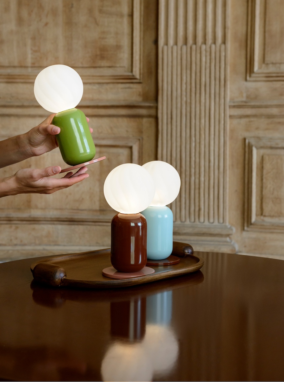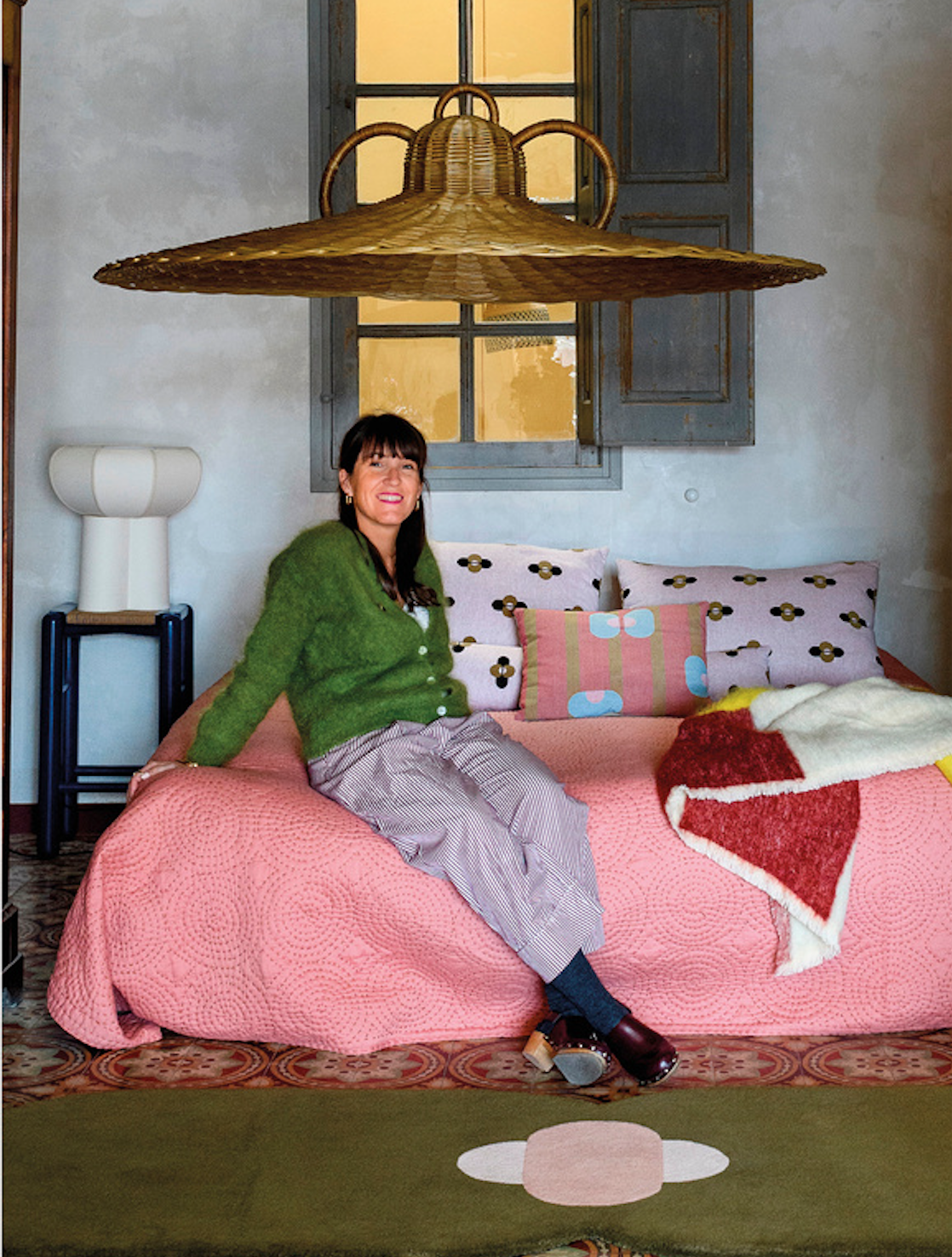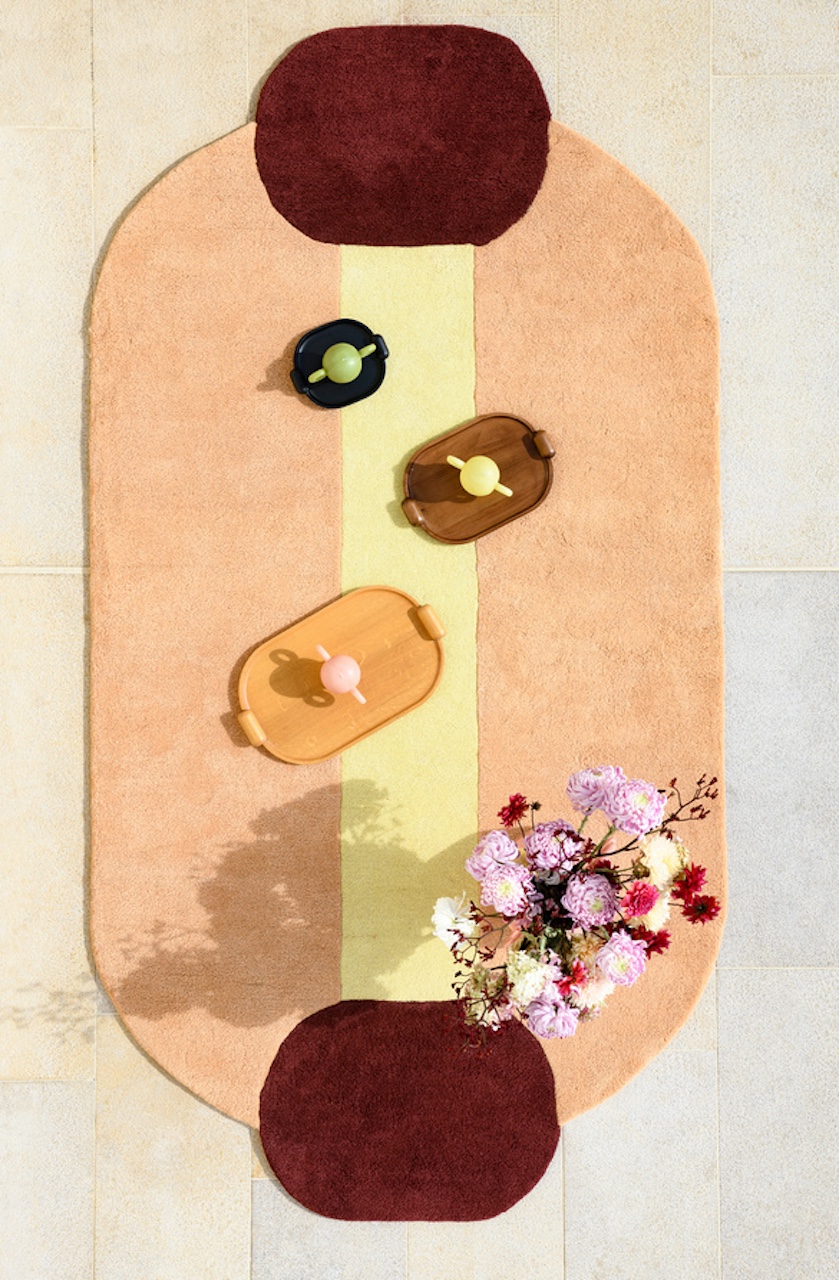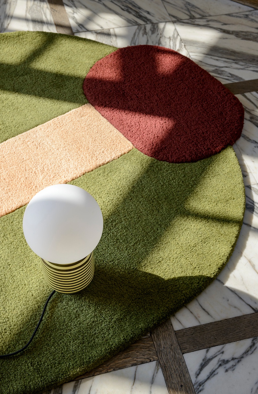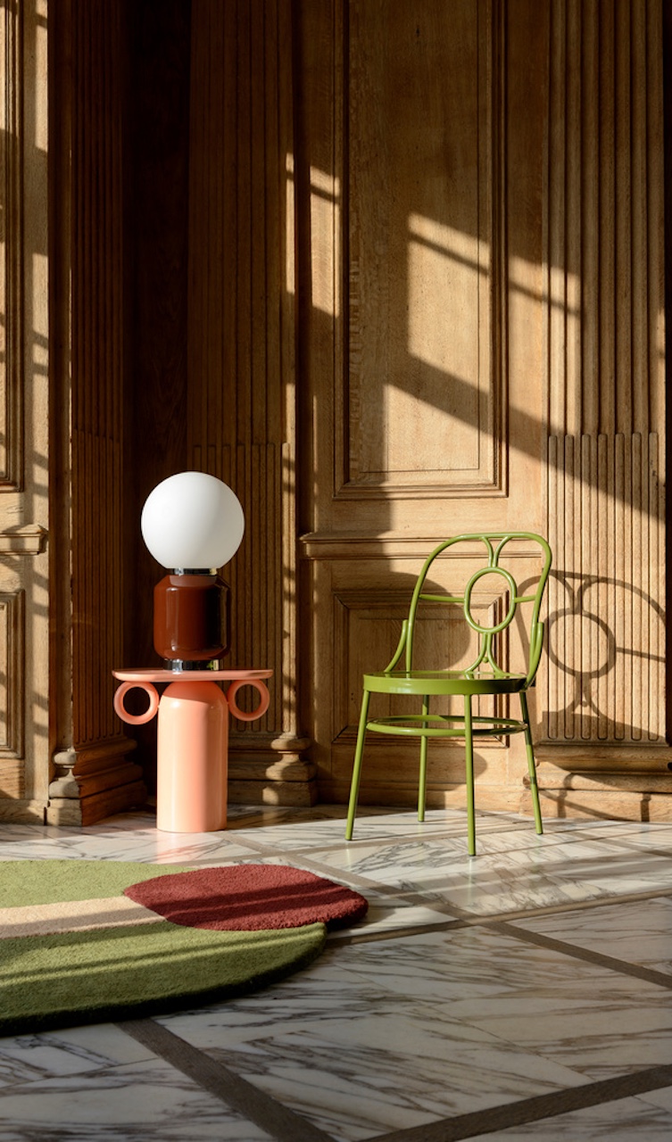 Mais on nous parle également de surprise. En effet, la collection s’enrichit de créations inédites pensées pour d’autres moments de vie. Comme par exemple une fin de soirée en terrasse. Là, la nouvelle lampe outdoor nomade promet de suivre les apéros. Les soirées lecture au fond du jardin peuvent à présent se faire sur l’élégante chaise en métal cintré – une revisite des mythiques chaises bistrot français. Lignes épurées, assise confortable, structure légère, elle est signée du vert signature de la designeuse. On retrouve aussi les tapis graphiques posés au centre d’un salon en oeuvre d’art ou en terrain de jeu des enfants ou encore la malicieuse table basse laquée rose.