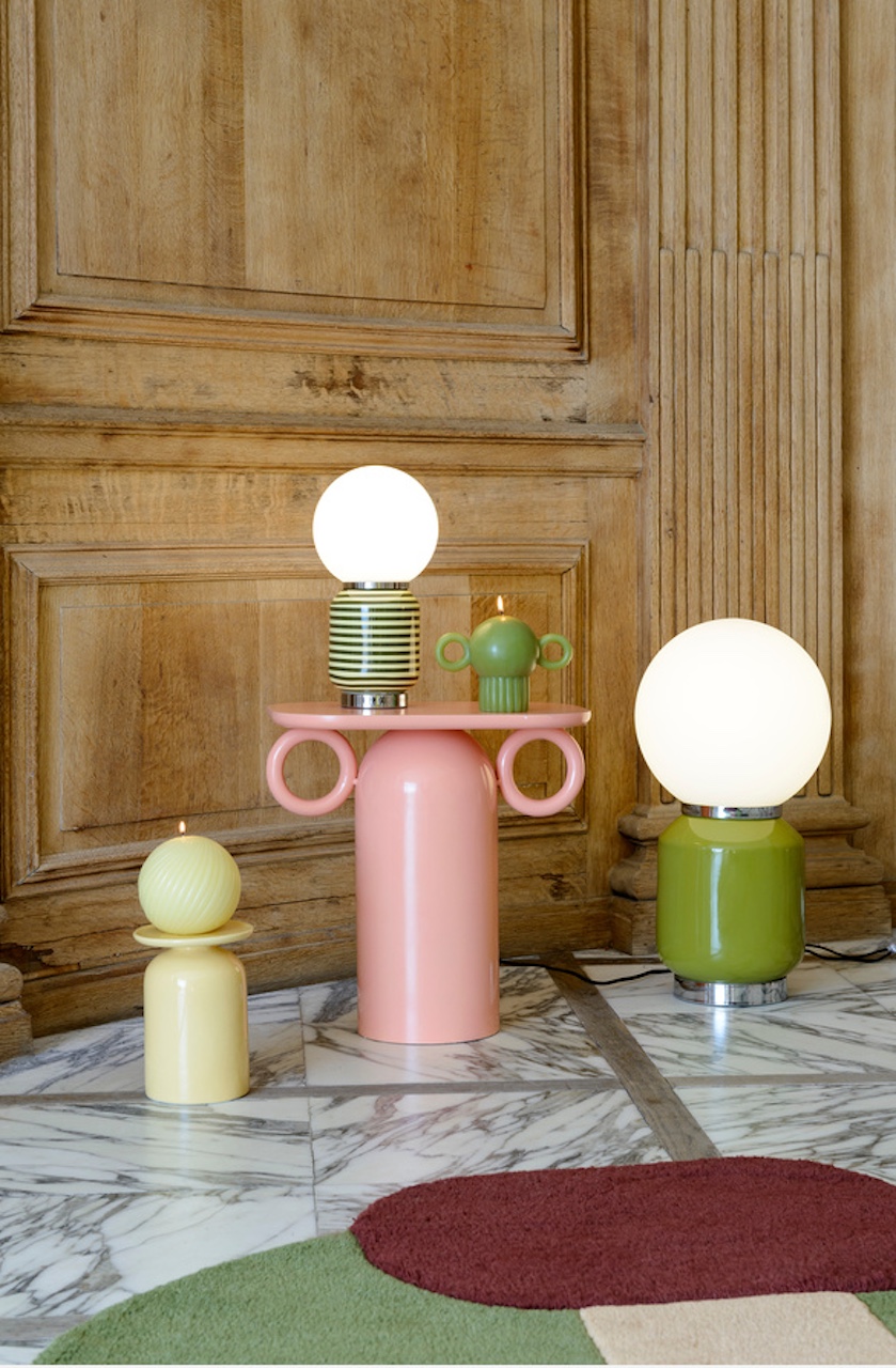 La palette de couleurs a été entièrement réinventée. Exit la douceur pastel de la première collaboration : ici, des teintes vibrantes et des rayures hypnotiques inspirées de Vasarely et de l’Op’art. Serons retrouvés les classiques items de la designers : vases signature, bougeoirs, lampes …