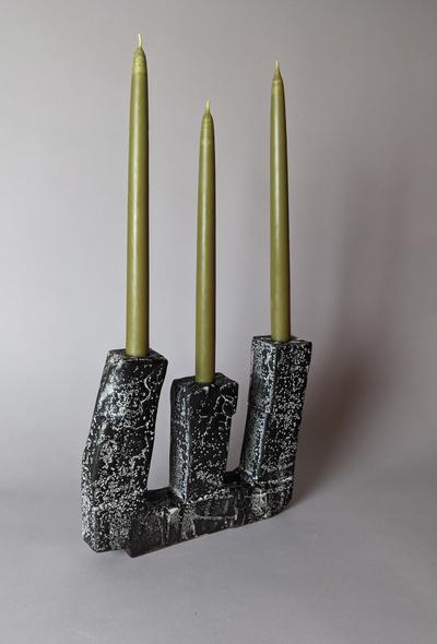 Installée à Bâle près de Mulhouse, Esther travaille la terre depuis 10 ans. Il y a deux ans, elle trouve enfin « sa recette magique » : un émail fait de cendre et poudre de métal qui donne à ses créations un aspect de bronze ou de métal forgé. Sa particularité ? Elle travaille par soustraction et non par ajout, dans la masse de terre. Résultat : des traits irréguliers, jamais droits, un côté maladroit qui fait tout le charme de ses pièces.