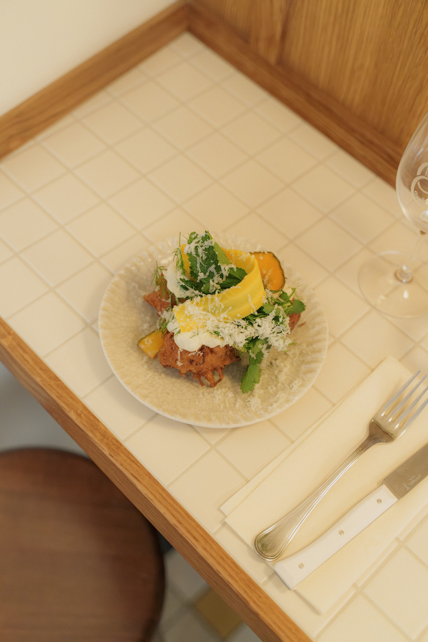 Servez les beignets avec un peu d’aïoli citronné sur le dessus, ainsi que des herbes fraîches et des pickles.