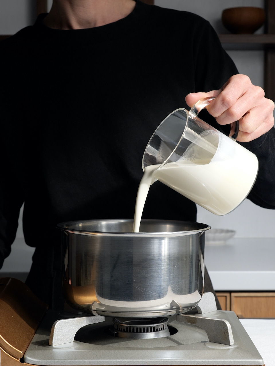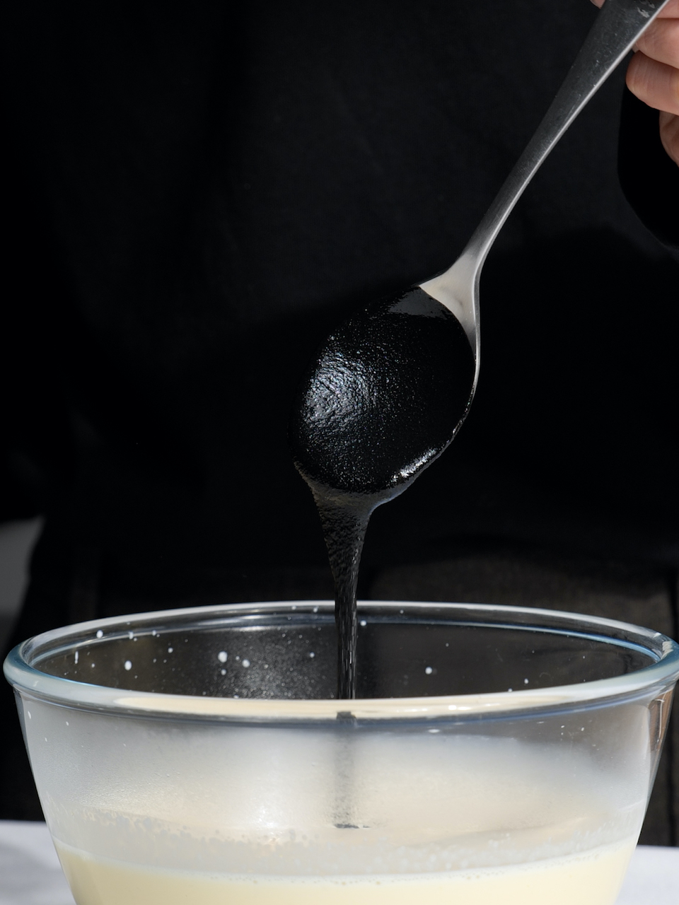 – Puis chauffer la crème jusqu’à frémissement. Ajouter la pâte de sésame noir, mélanger pour bien la dissoudre, puis laisser infuser quelques minutes hors du feu. (Il est aussi possible d’ajouter la pâte de sésame noir directement dans le mélange crème/œufs, mais l’incorporer dans la crème chaude permet une texture plus homogène — si elle est ajoutée après ici, c’est pour une contrainte de tournage.)