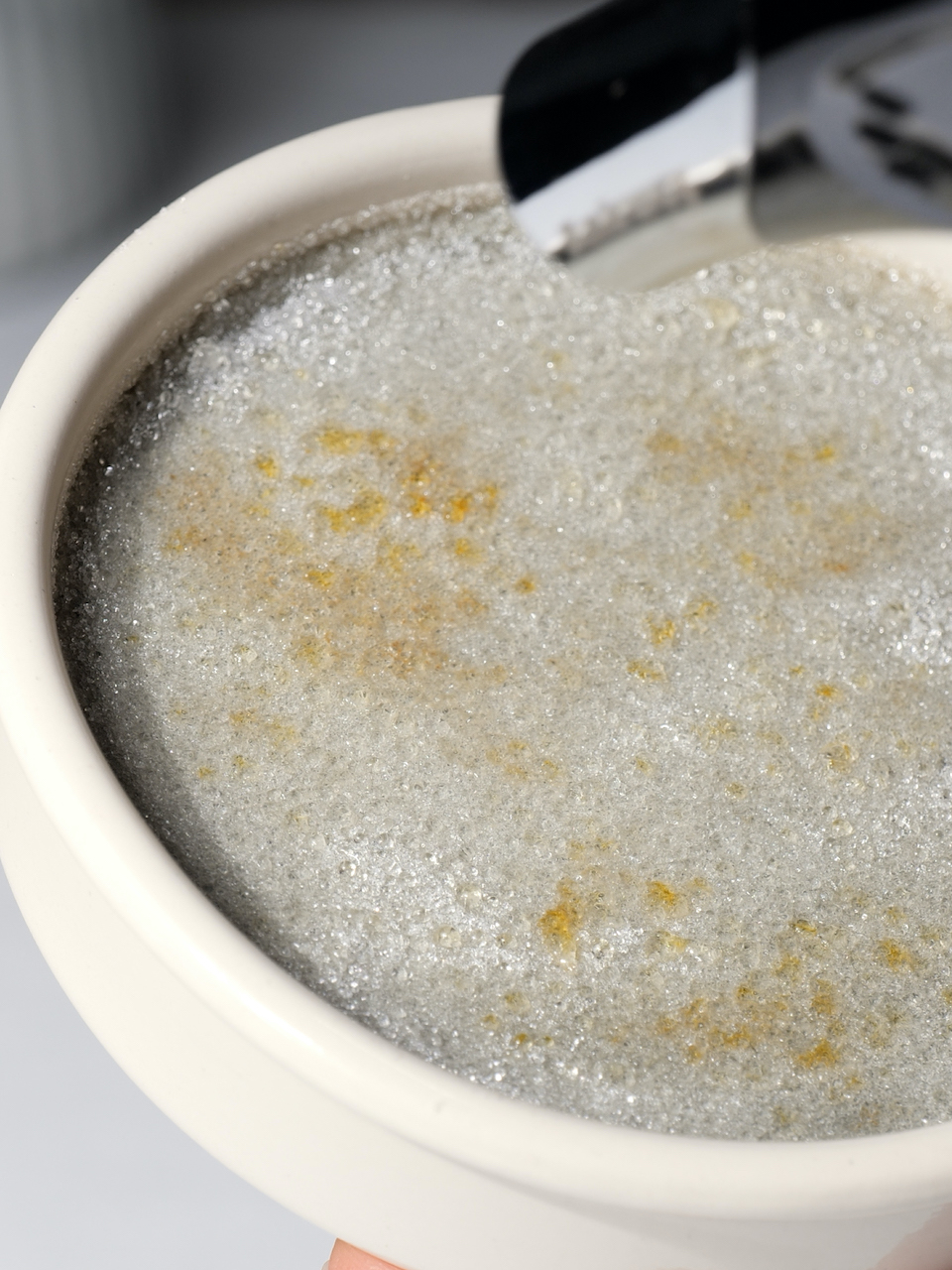 – Ensuite fouetter les jaunes avec le sucre sans blanchir excessivement. Verser la crème chaude au sésame noir sur les jaunes en mélangeant doucement. Filtrer si nécessaire pour obtenir une texture bien lisse. Répartir ensuite dans 4 ramequins.